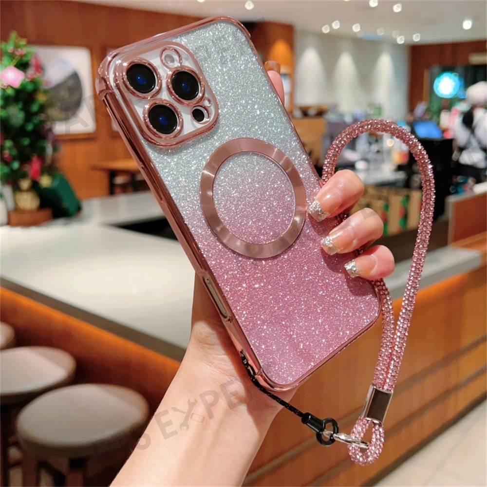 For iPhone 16 Pro Max Case Compatible with MagSafe Electroplated Gradient Glitter Phone Cover with Lanyard - Rose Pink