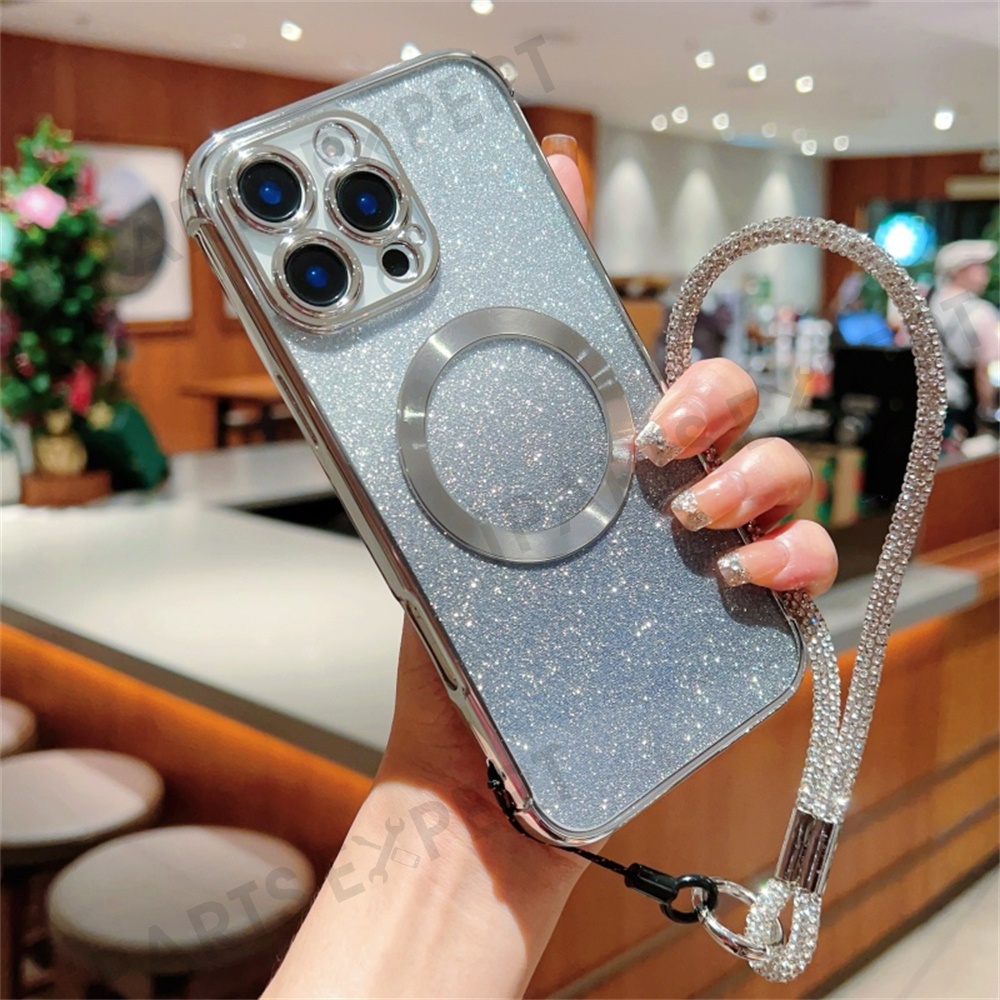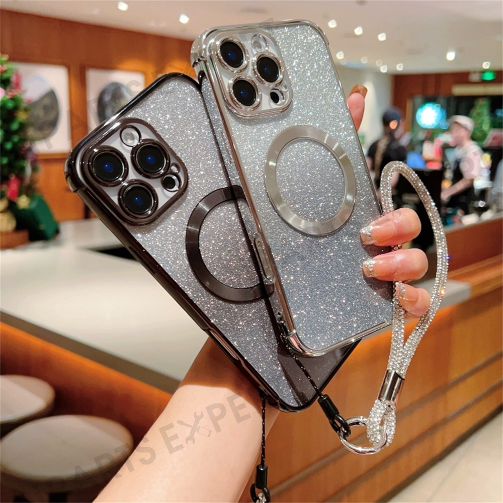 For iPhone 16 Pro Max Case Compatible with MagSafe Electroplated Gradient Glitter Phone Cover with Lanyard - Silver