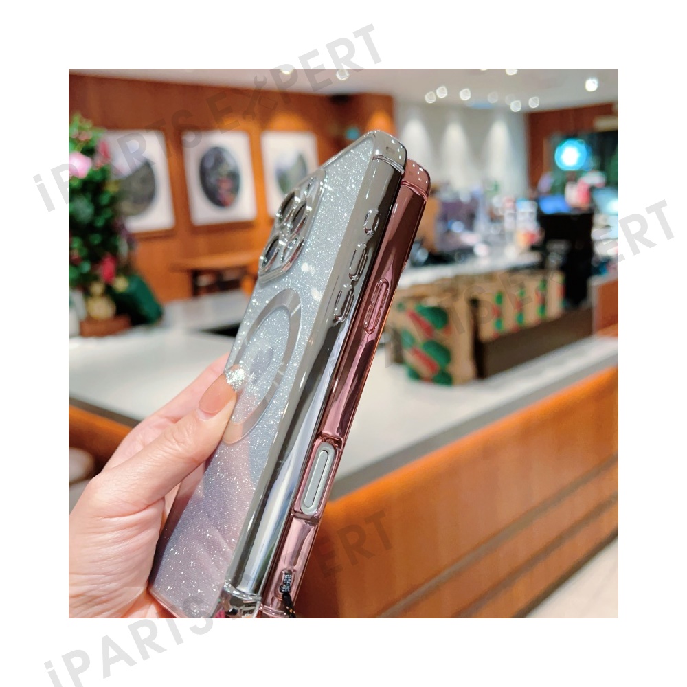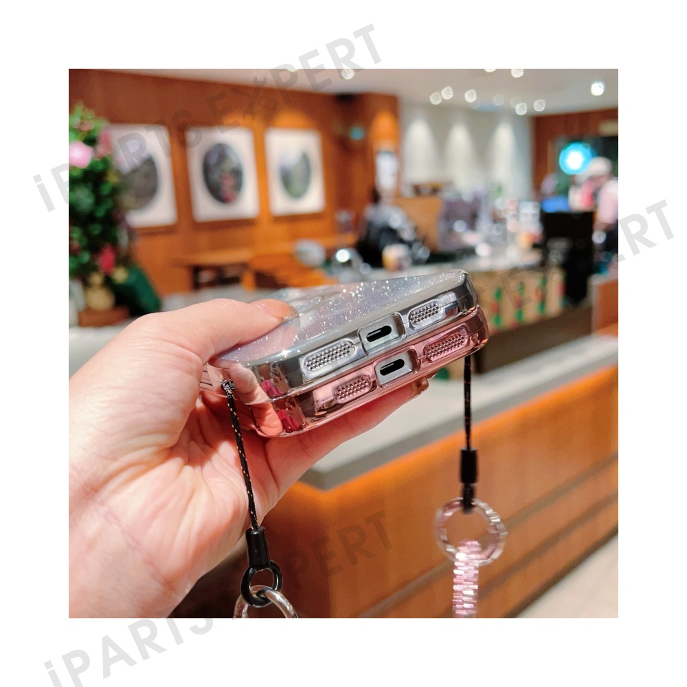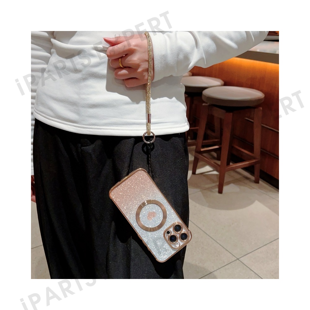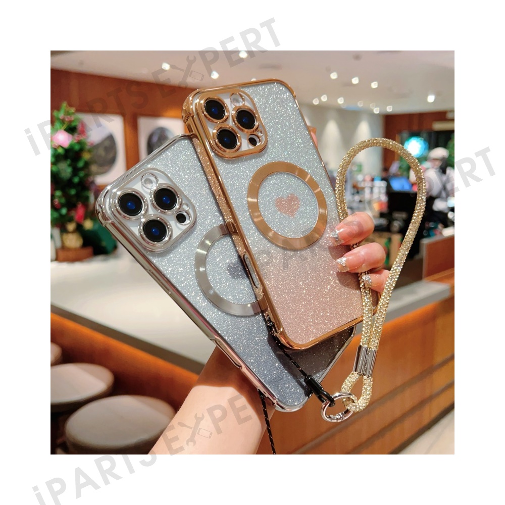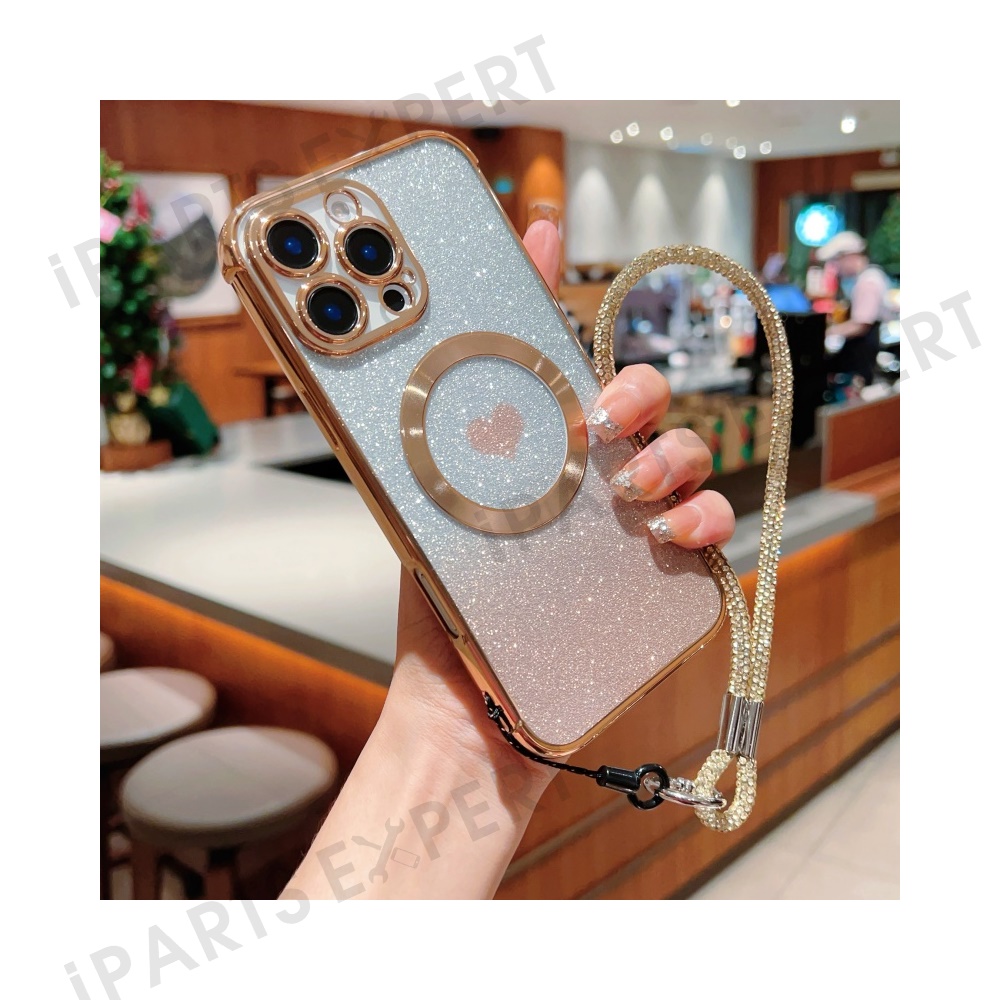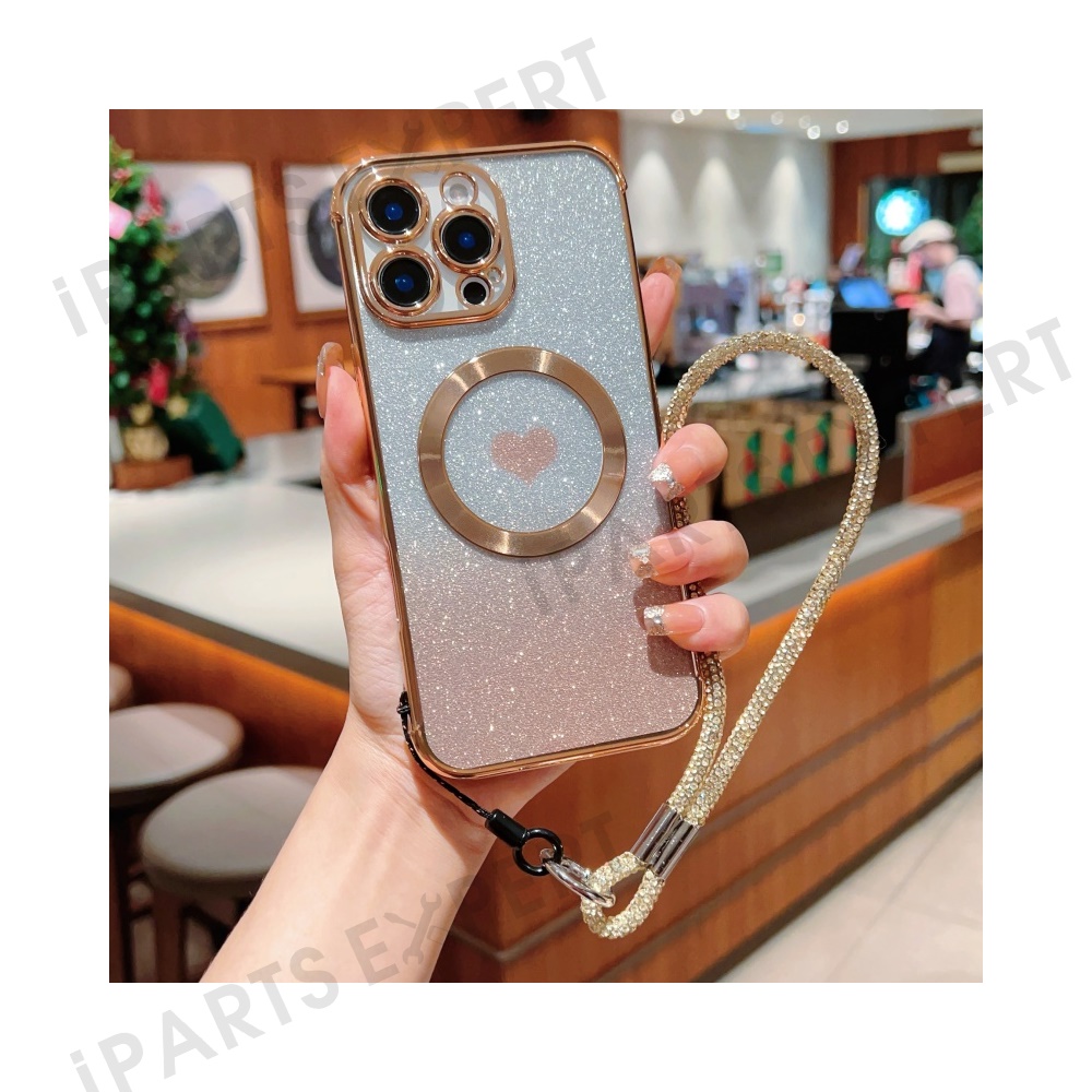 For iPhone 16 Pro Max Case Compatible with MagSafe TPU Phone Cover with Strap Heart Gradient Sparkle - Gold