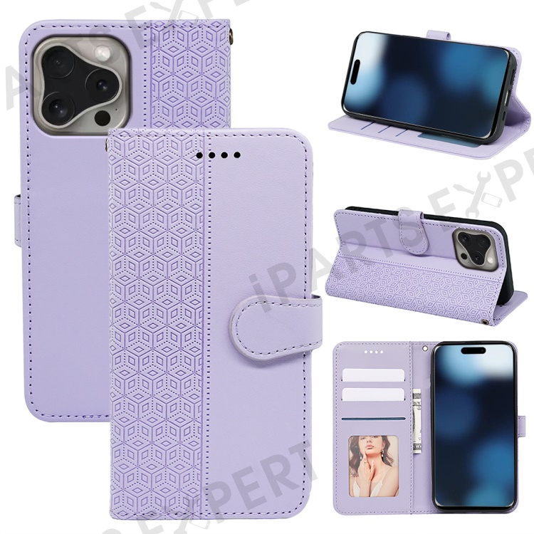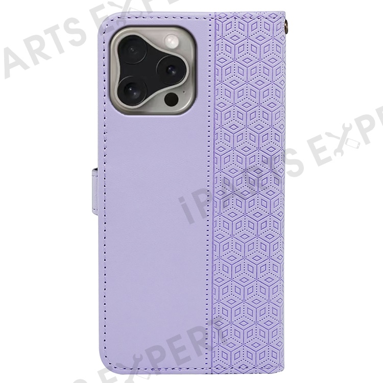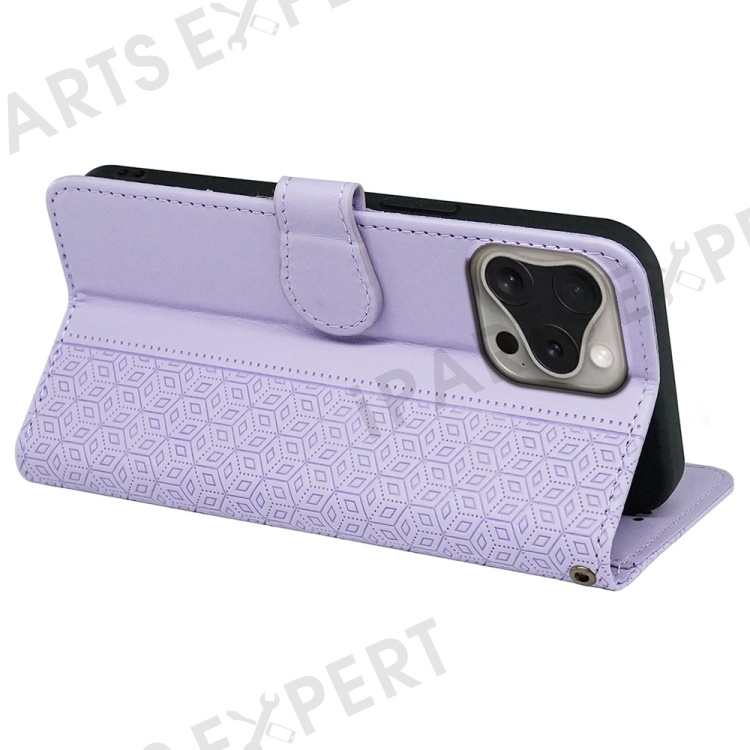 For iPhone 16 Pro Max Case Cubic Grid Imprinted Leather Phone Cover with Wallet - Purple