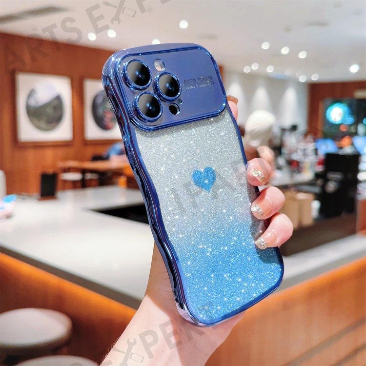For iPhone 16 Pro Max Case Love Heart Gradient Glitter TPU Phone Cover Electroplating Curly Frame - Blue