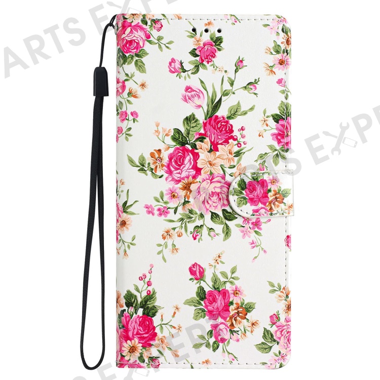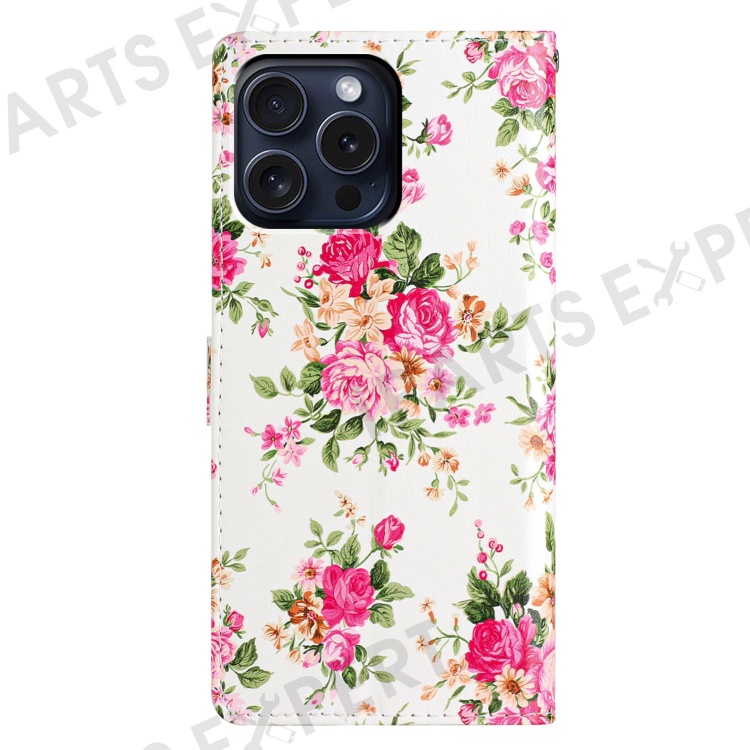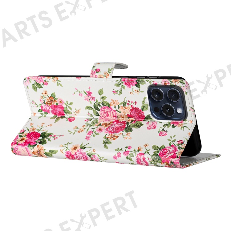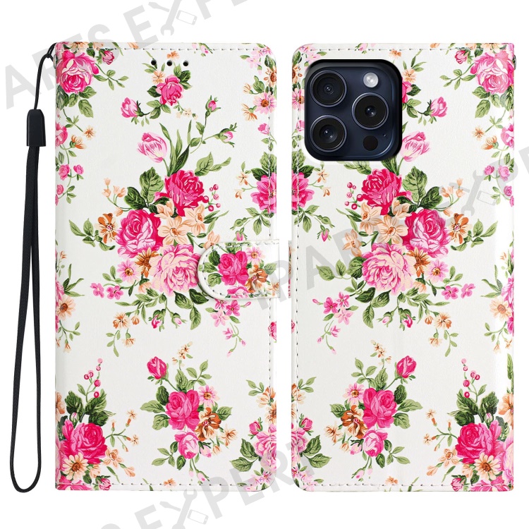 For iPhone 16 Pro Max Case Pattern Print PU Leather Card Slots Phone Cover with Wrist Strap - Red Flowers