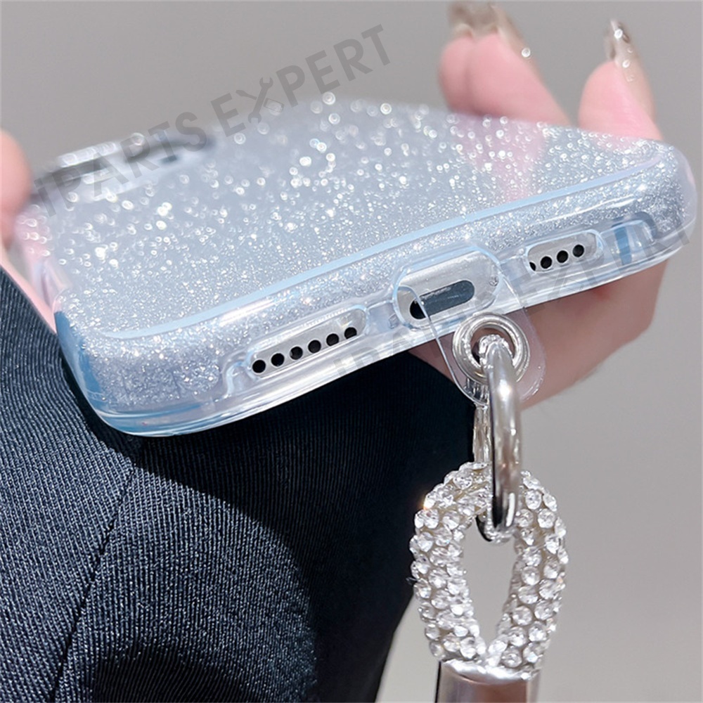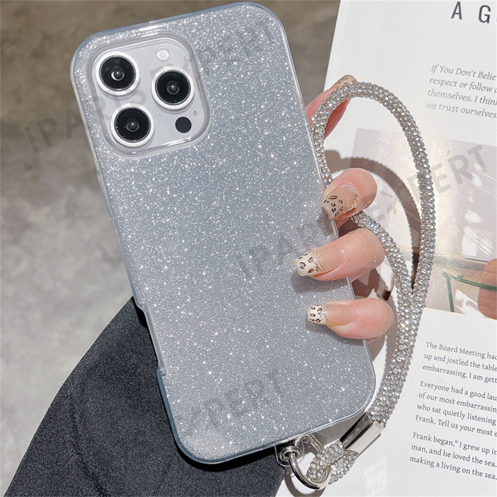 For iPhone 16 Pro Max Case with Wrist Strap TPU Phone Back Cover Glitter Design - Silver