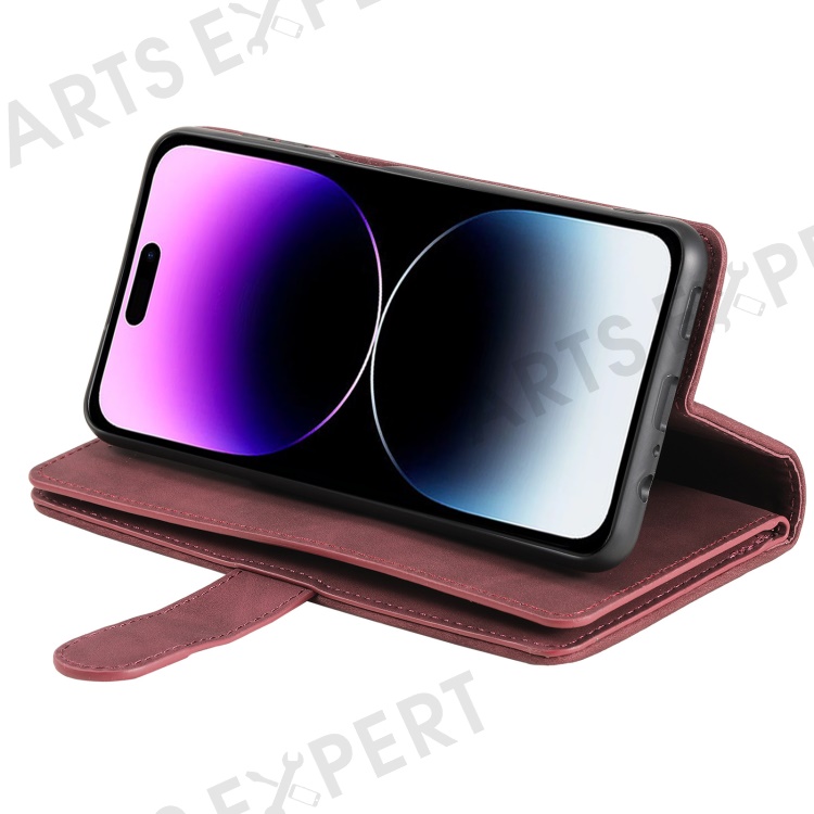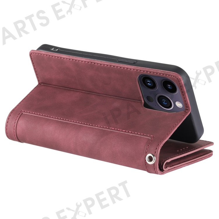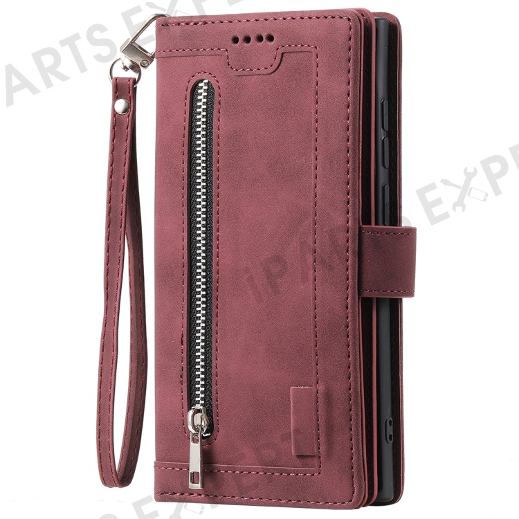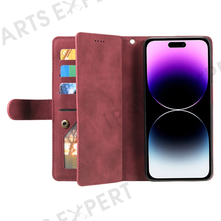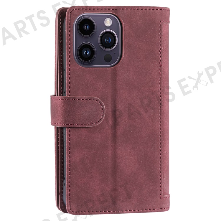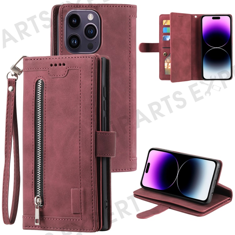 For iPhone 16 Pro Max Case Zipper Pocket 9 Card Slots PU Leather Phone Cover - Wine Red