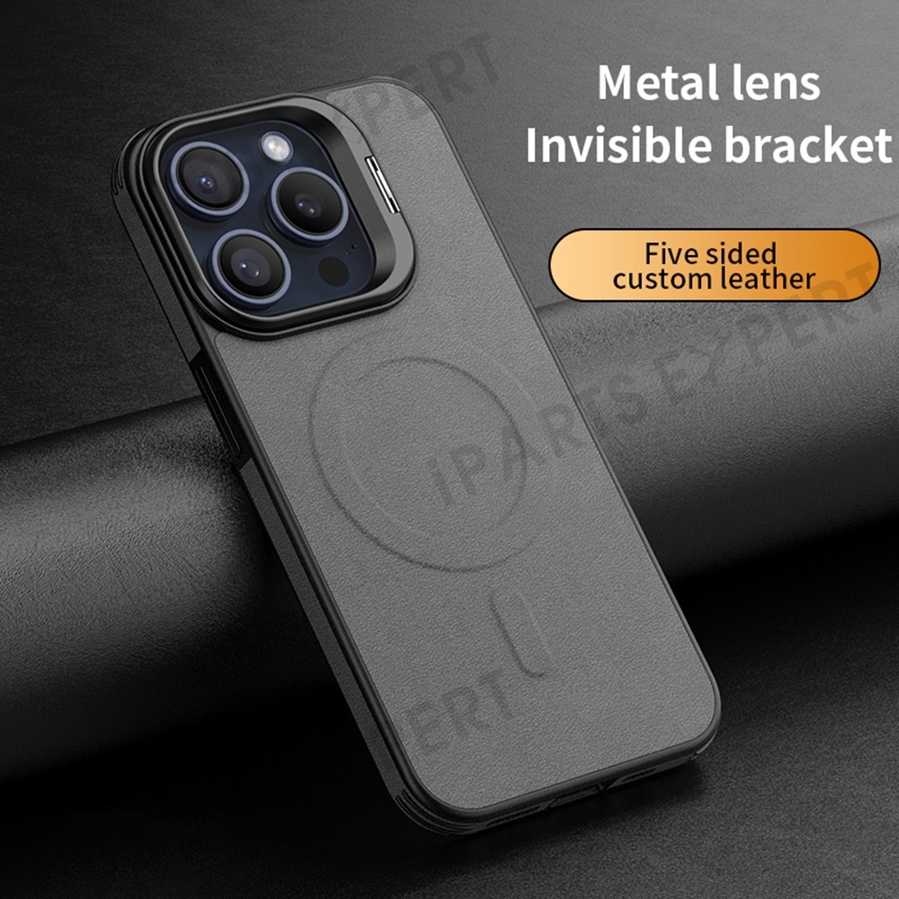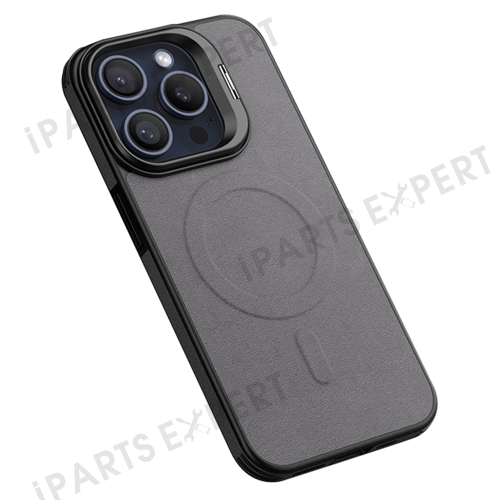For iPhone 16 Pro Max Magnetic Case with Lens Kickstand Leather Phone Back Cover - Grey