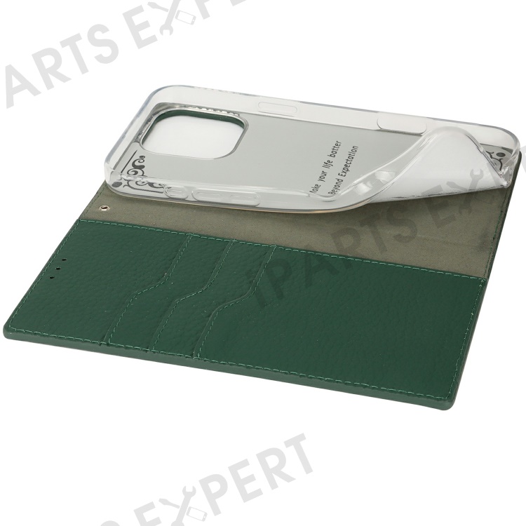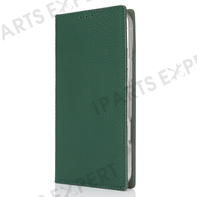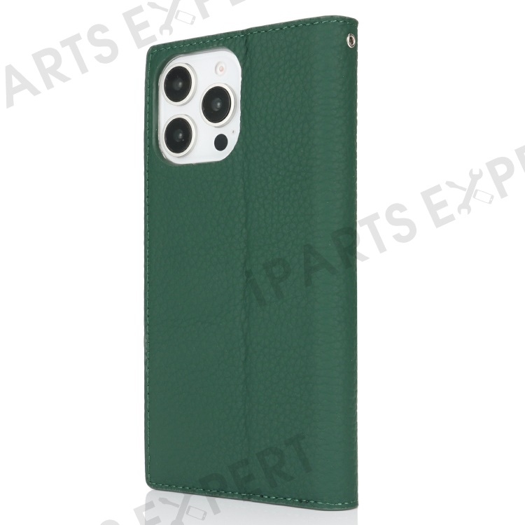 For iPhone 16 Pro Max Wallet Case Genuine Cow Leather Phone Cover Litchi Texture - Green