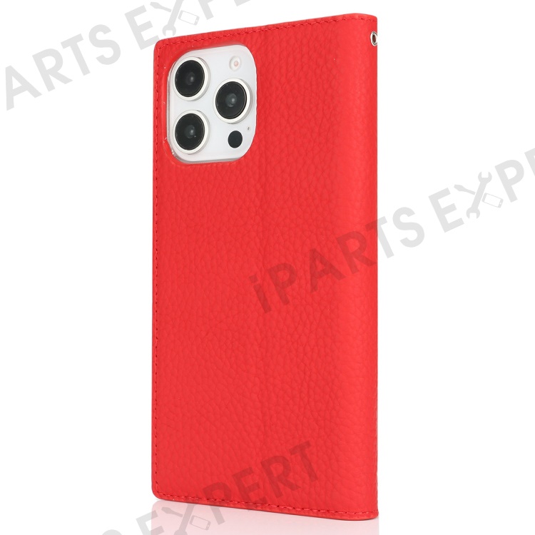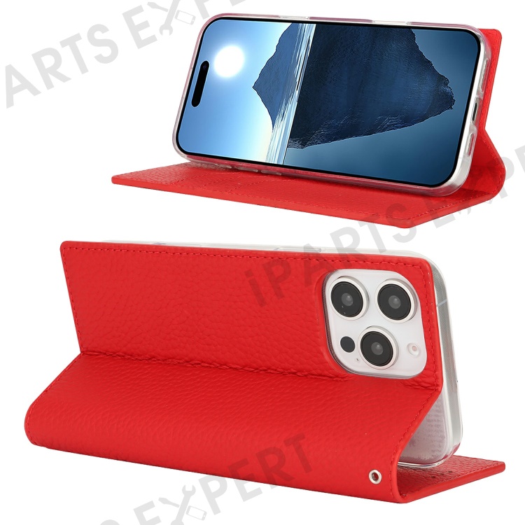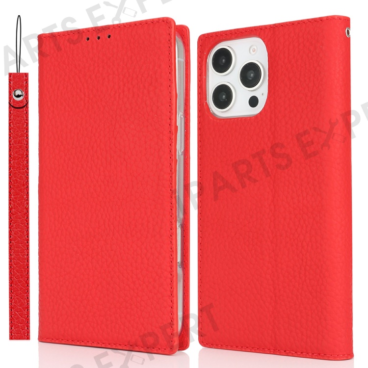 For iPhone 16 Pro Max Wallet Case Genuine Cow Leather Phone Cover Litchi Texture - Red