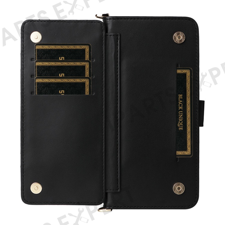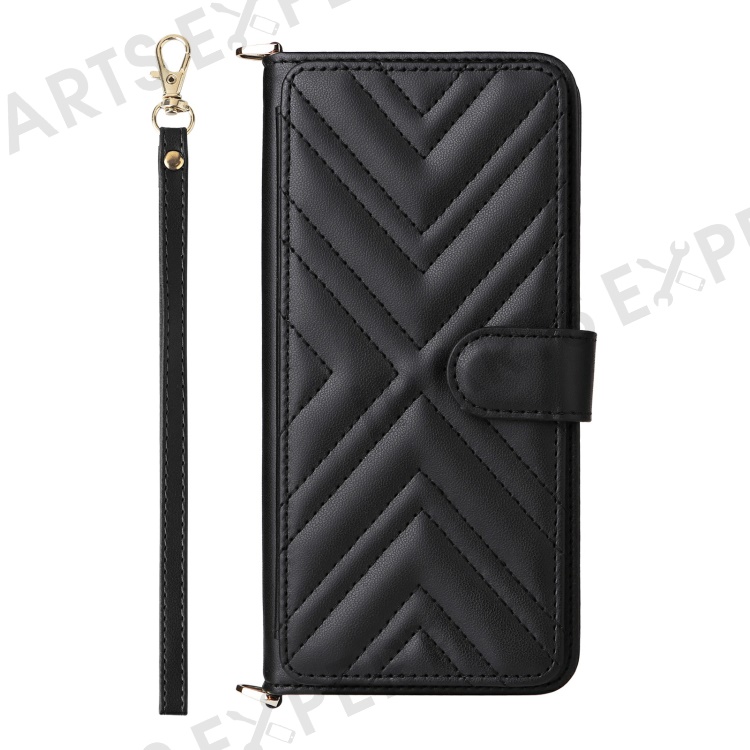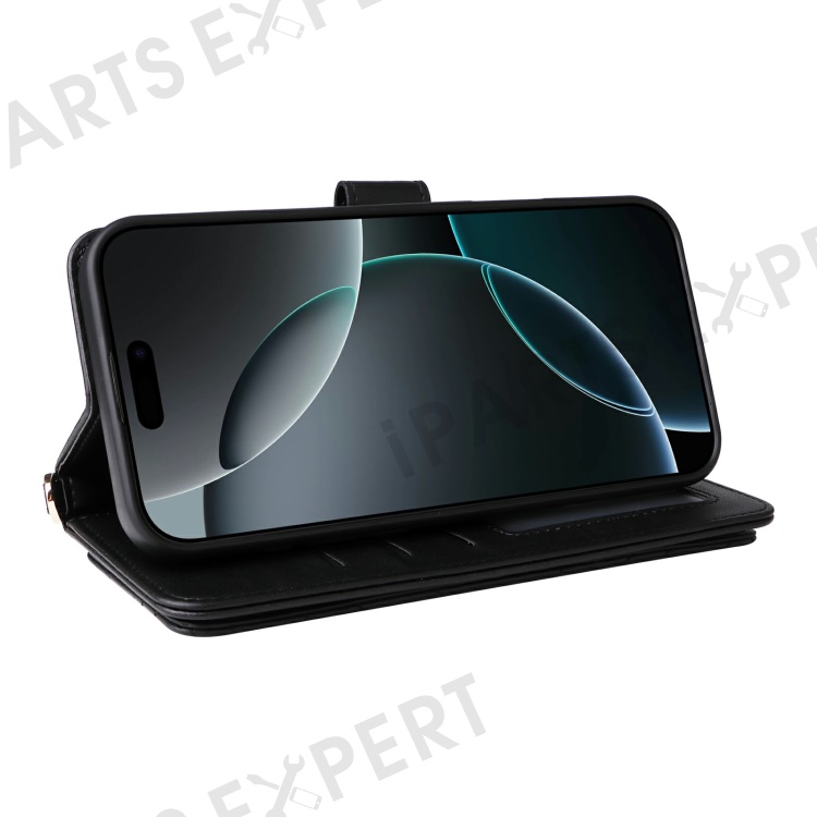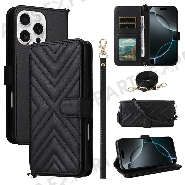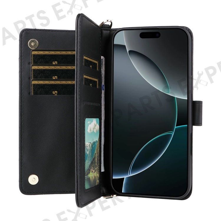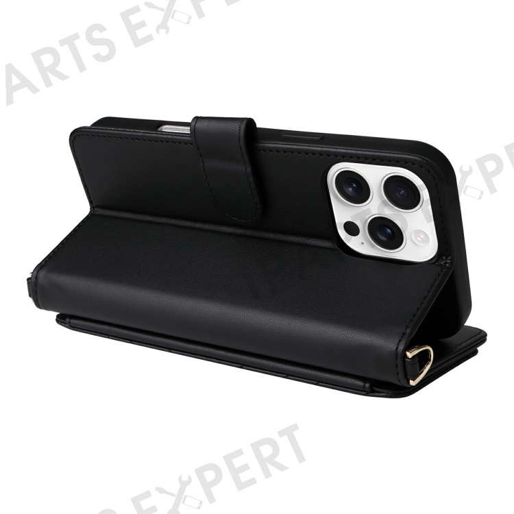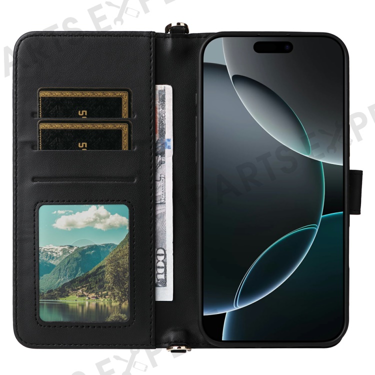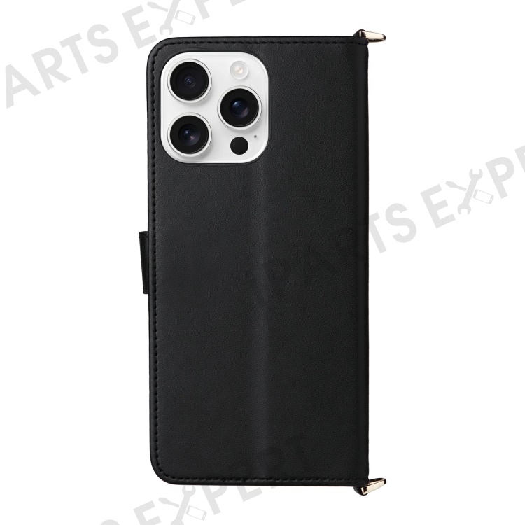 For iPhone 16 Pro Max Wallet Case with Shoulder / Wrist Strap Leather Phone Cover Stand - Black
