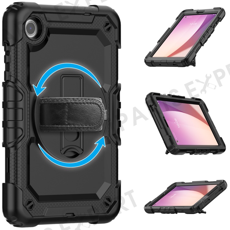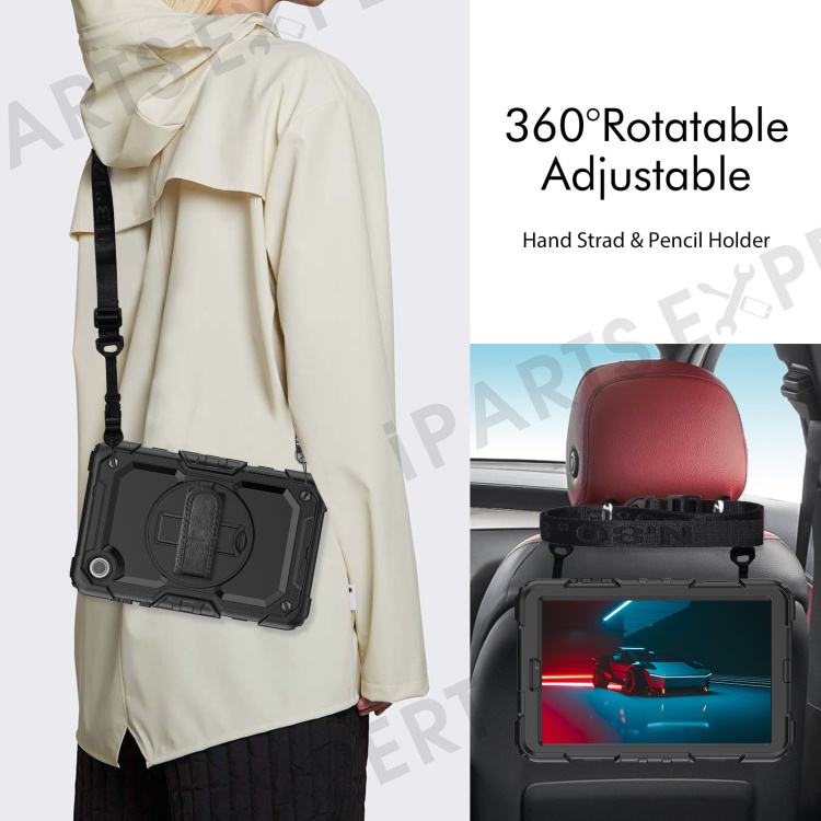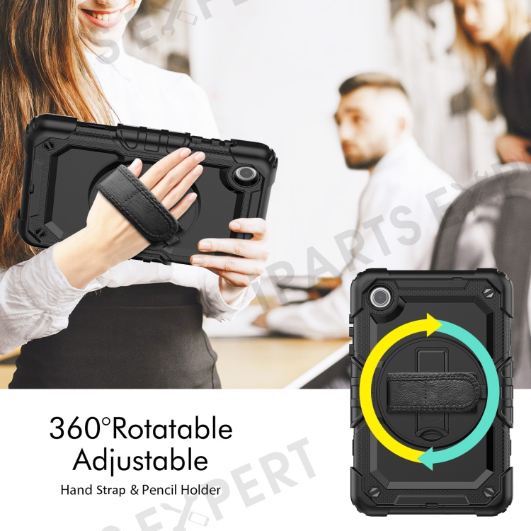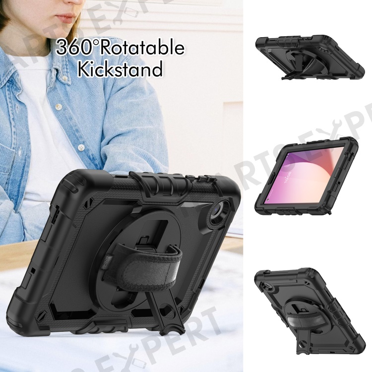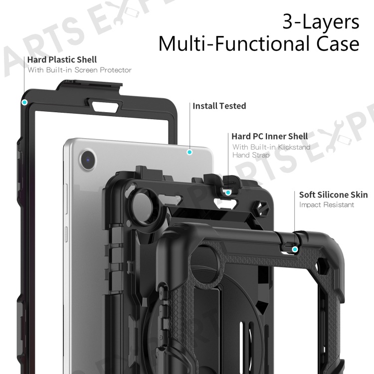 This 3-layers multifunction tablet case is combined with hard PC frame with built-in PET screen protector, hard PC inner layer with built-in kickstand hand strap, and outer silicone layer. Impact-resistant design and shock-absorbing silicone + PC materials fully cover the back and edges, protecting against accidental drops and falls. The rotary kickstand can free your hands when you're reading, watching, and surfing the internet in your free time. The portable hand grip kickstand is designed for easy carrying.