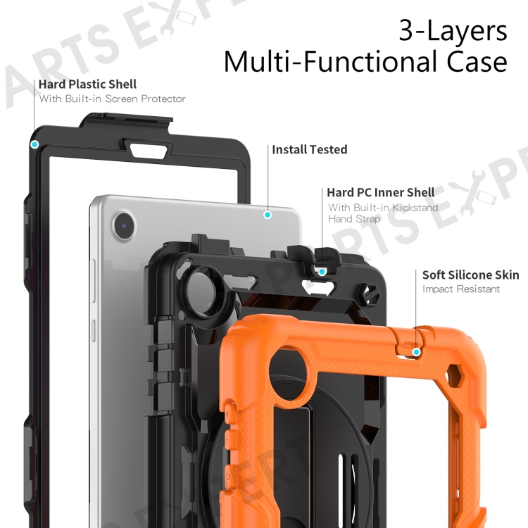 This 3-layers multifunction tablet case is combined with hard PC frame with built-in PET screen protector, hard PC inner layer with built-in kickstand hand strap, and outer silicone layer. Impact-resistant design and shock-absorbing silicone + PC materials fully cover the back and edges, protecting against accidental drops and falls. The rotary kickstand can free your hands when you're reading, watching, and surfing the internet in your free time. The portable hand grip kickstand is designed for easy carrying.