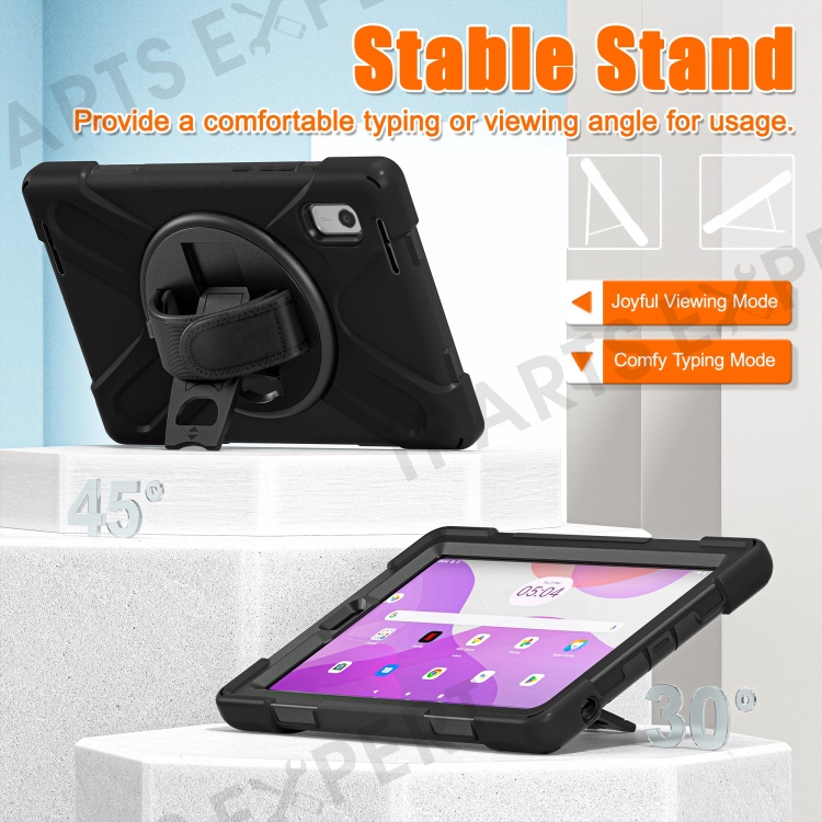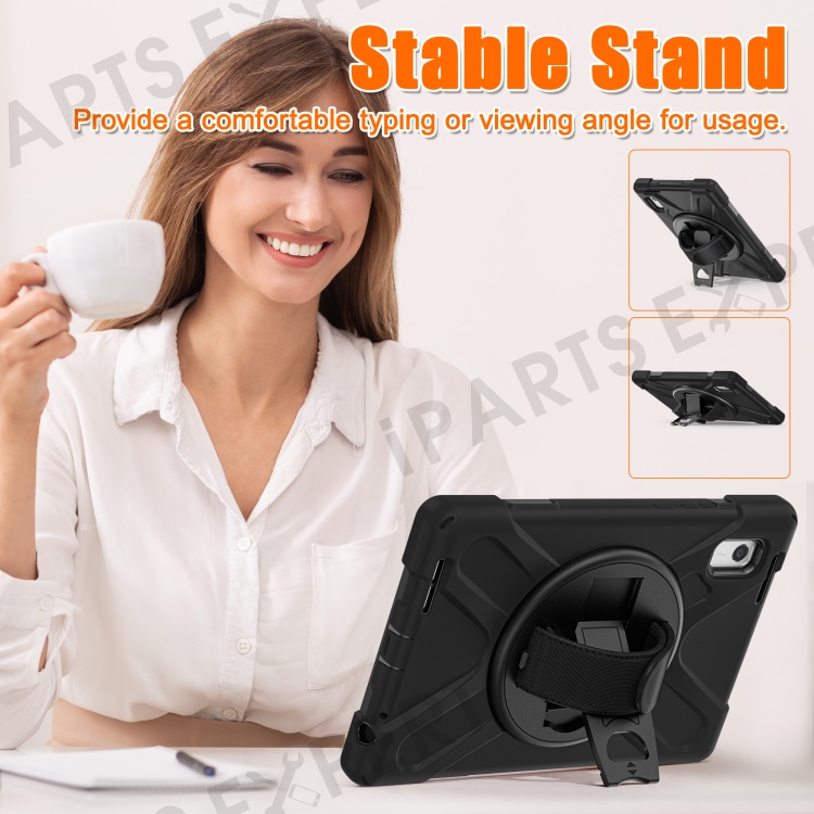 Integrated 360-degree rotary kickstand with a magic tape hand band frees your hands for landscape or portrait viewing