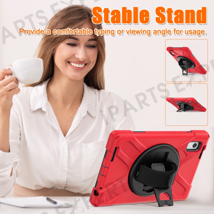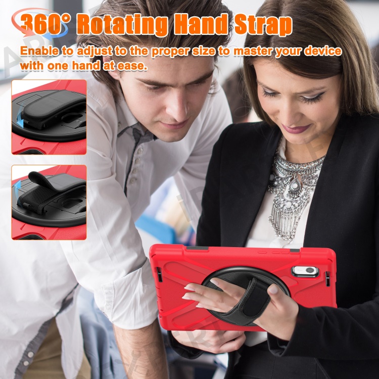 Integrated 360-degree rotary kickstand with a magic tape hand band frees your hands for landscape or portrait viewing
