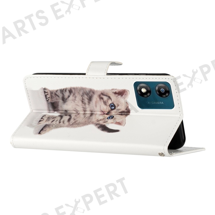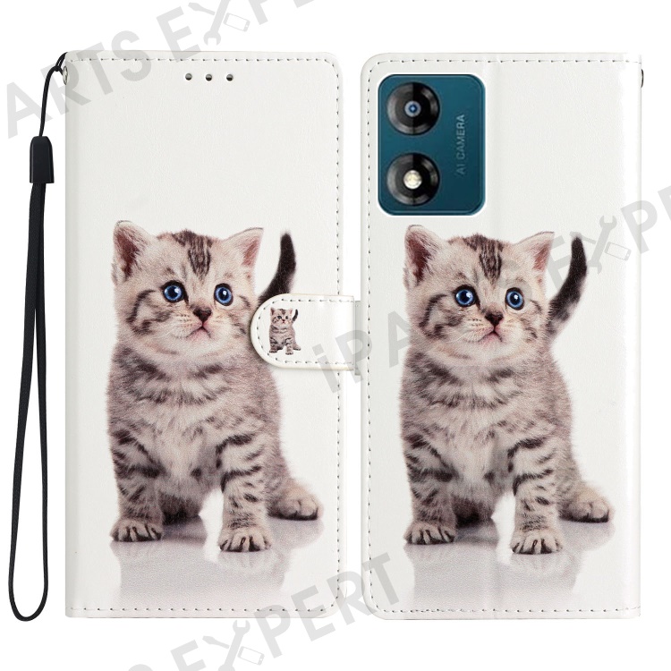 For Motorola Moto E13 4G PU Leather Pattern Printing Phone Case Stand Wallet Flip Phone Cover with Strap - Cute Cat