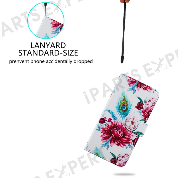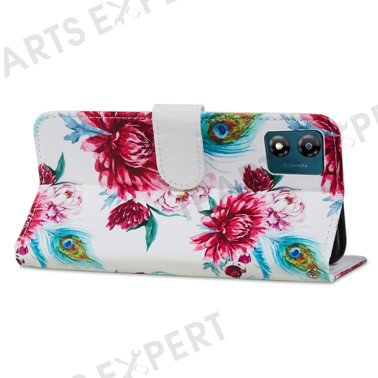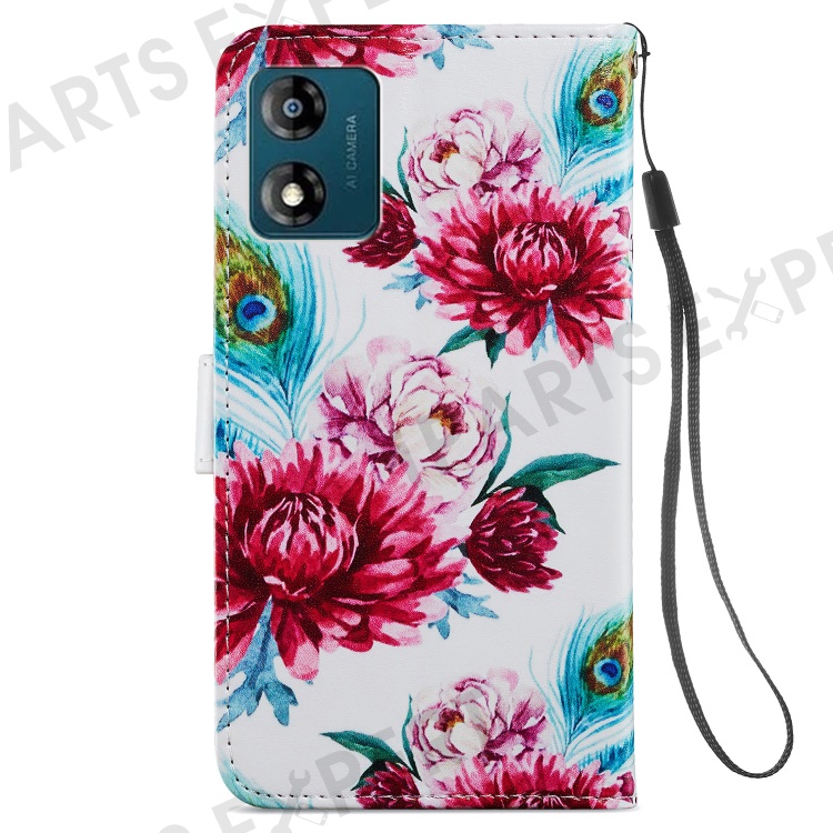 For Motorola Moto E13 4G PU Leather Pattern Printing Phone Case Stand Wallet Flip Phone Cover with Strap - Peacock Flower