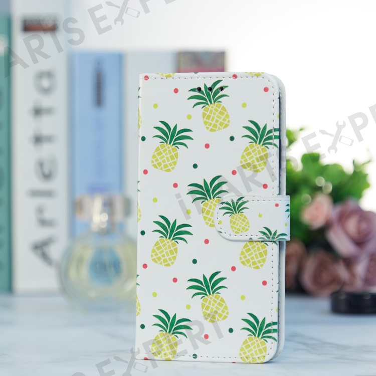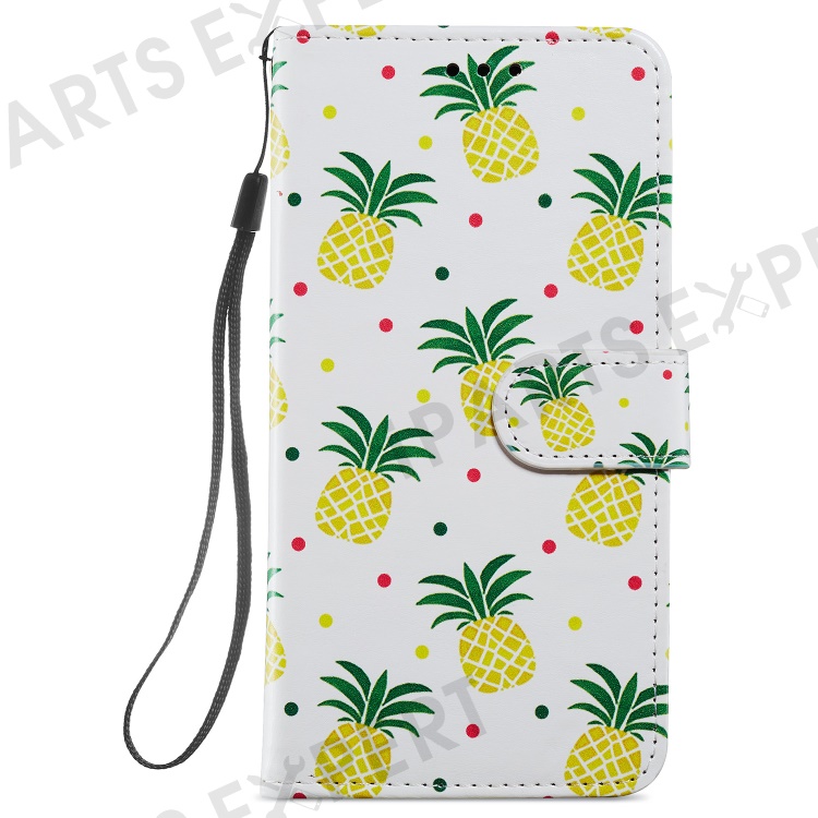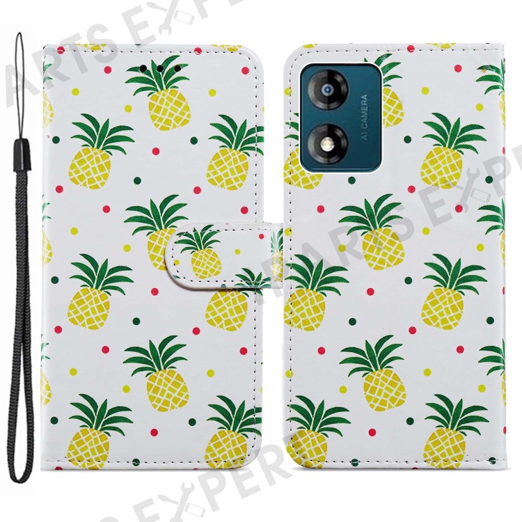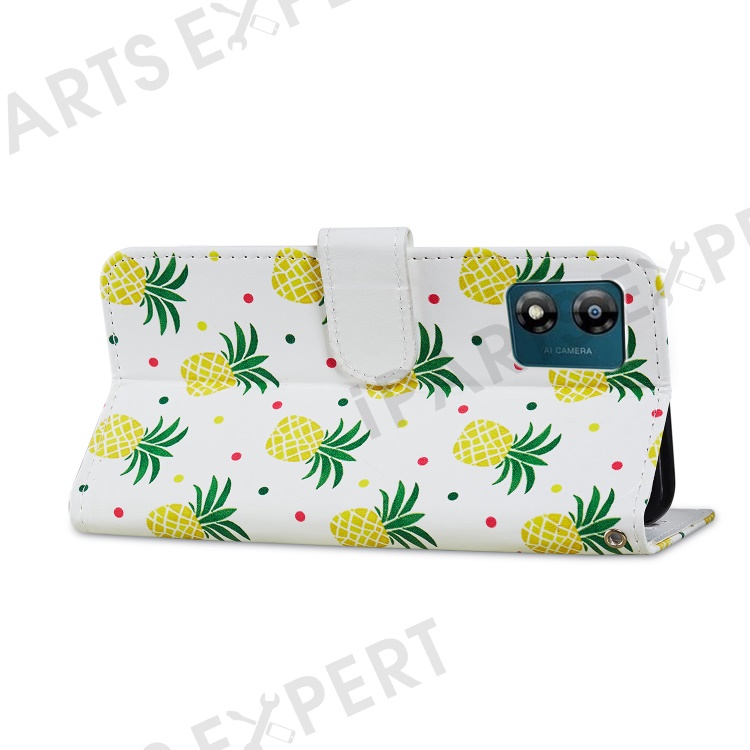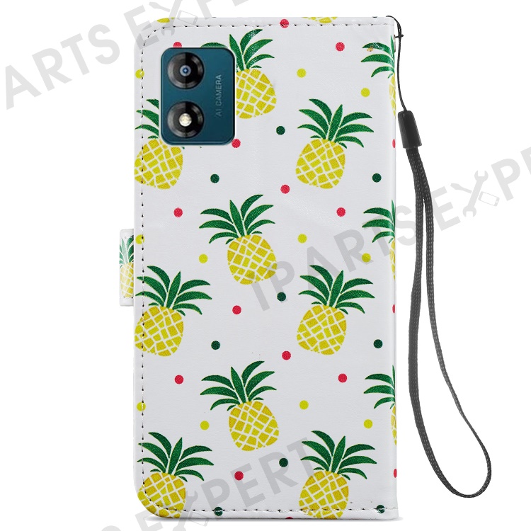 For Motorola Moto E13 4G PU Leather Pattern Printing Phone Case Stand Wallet Flip Phone Cover with Strap - Pineapple