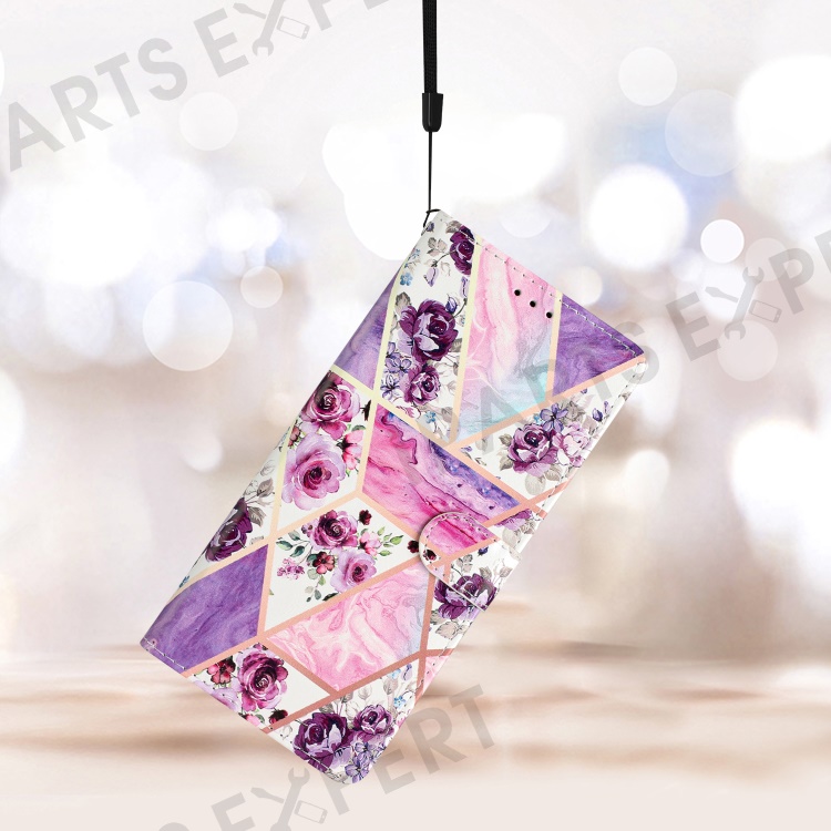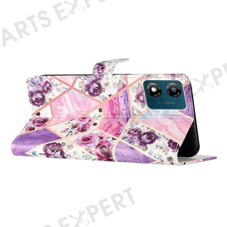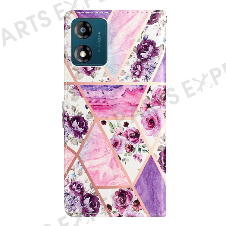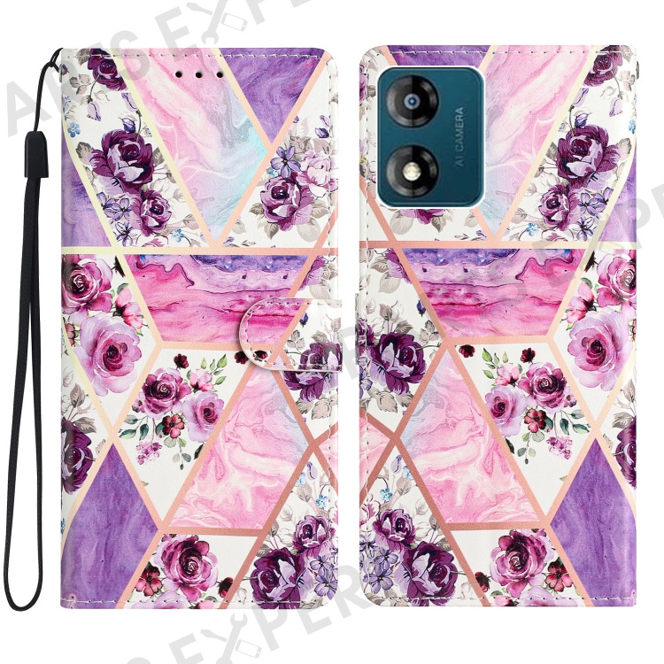 For Motorola Moto E13 4G PU Leather Pattern Printing Phone Case Stand Wallet Flip Phone Cover with Strap - Purple Flowers
