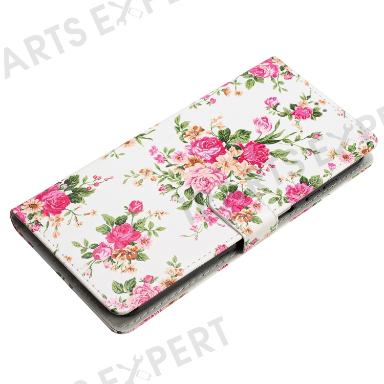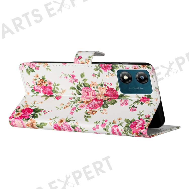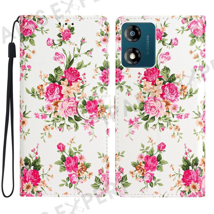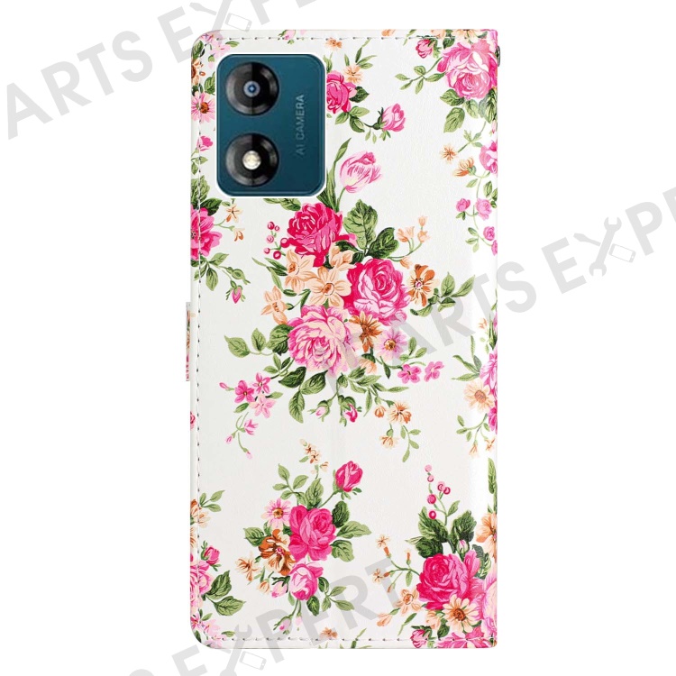 For Motorola Moto E13 4G PU Leather Pattern Printing Phone Case Stand Wallet Flip Phone Cover with Strap - Red Flowers