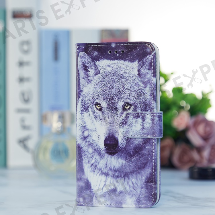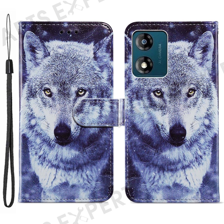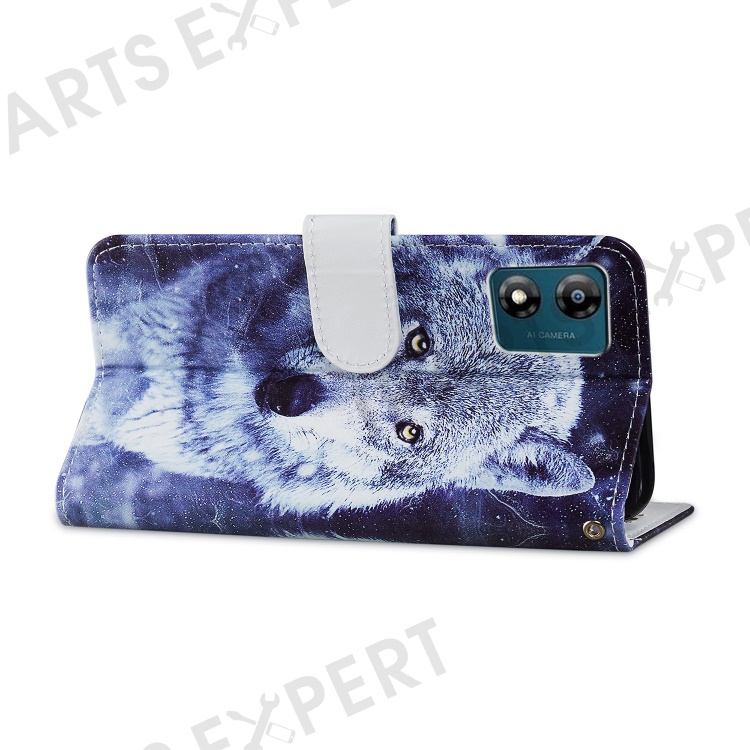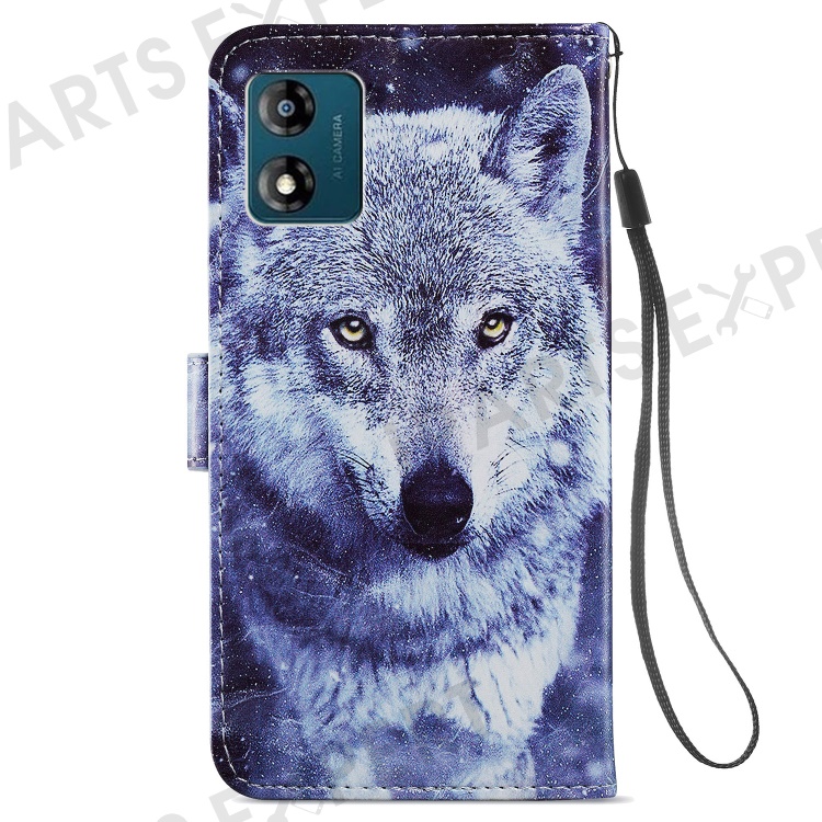 For Motorola Moto E13 4G PU Leather Pattern Printing Phone Case Stand Wallet Flip Phone Cover with Strap - Wolf