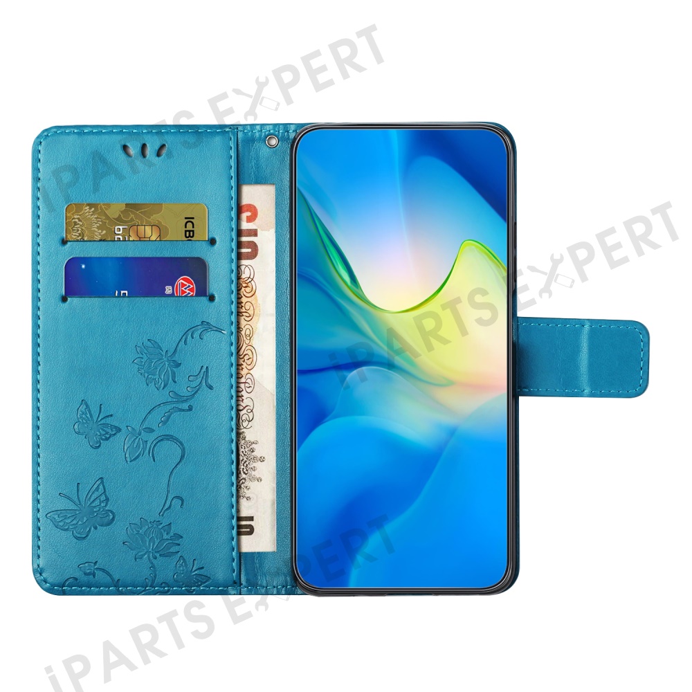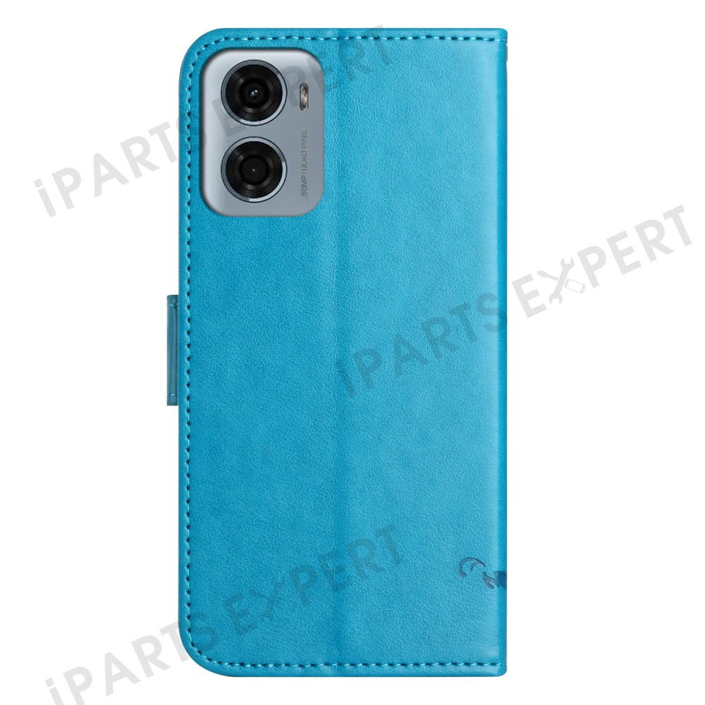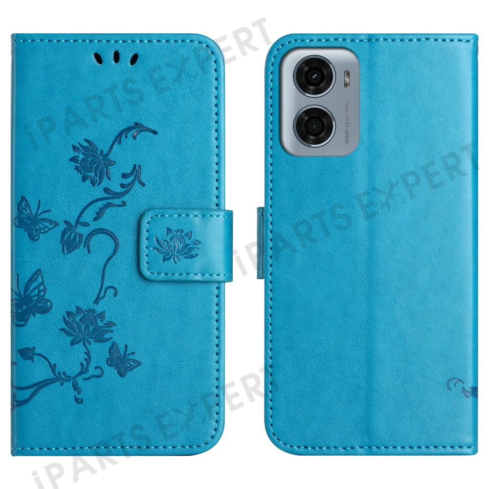 For Motorola Moto E15 4G / G05 4G Case Wallet Stand Imprinted Butterfly Flower PU Leather Phone Cover - Blue