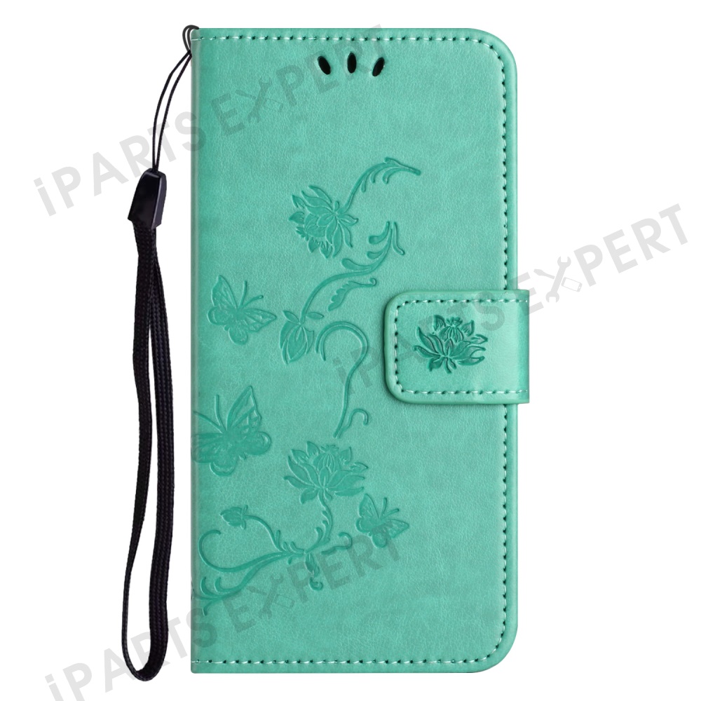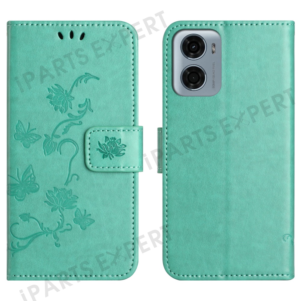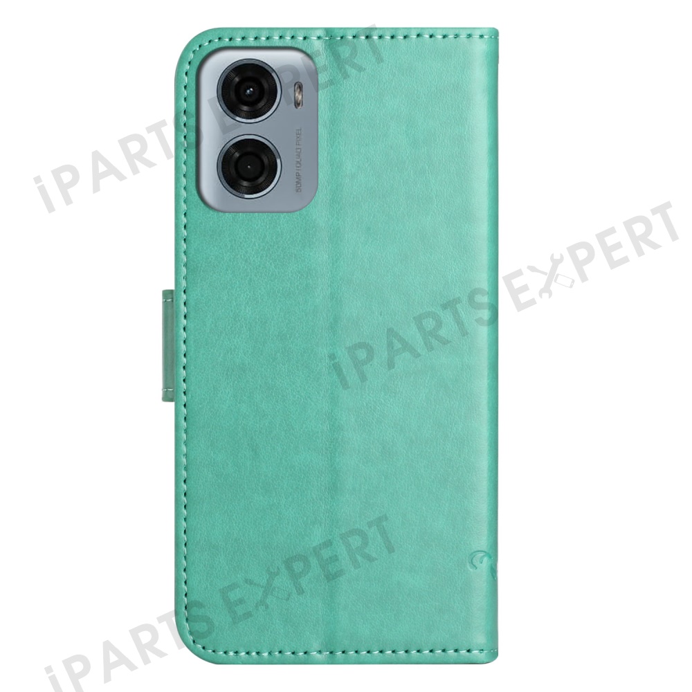 For Motorola Moto E15 4G / G05 4G Case Wallet Stand Imprinted Butterfly Flower PU Leather Phone Cover - Cyan