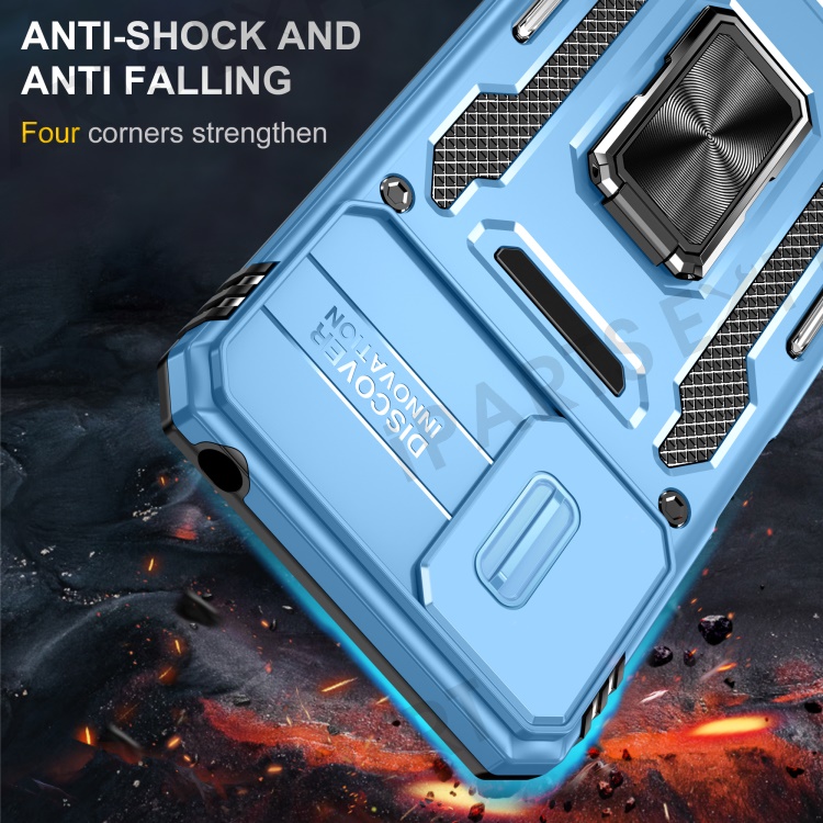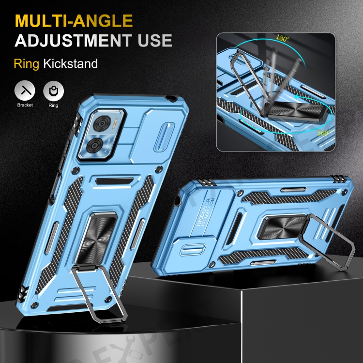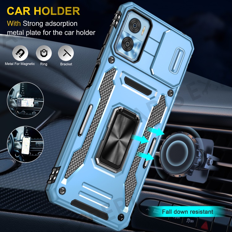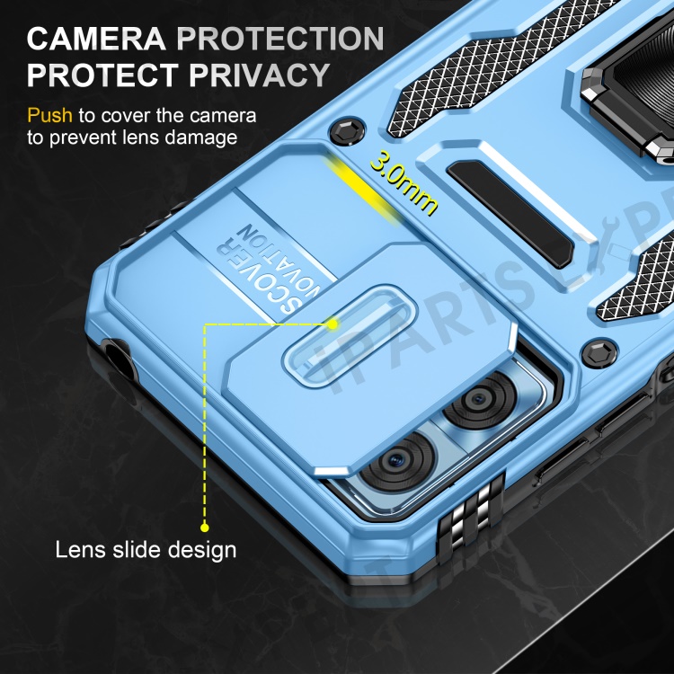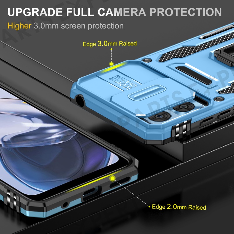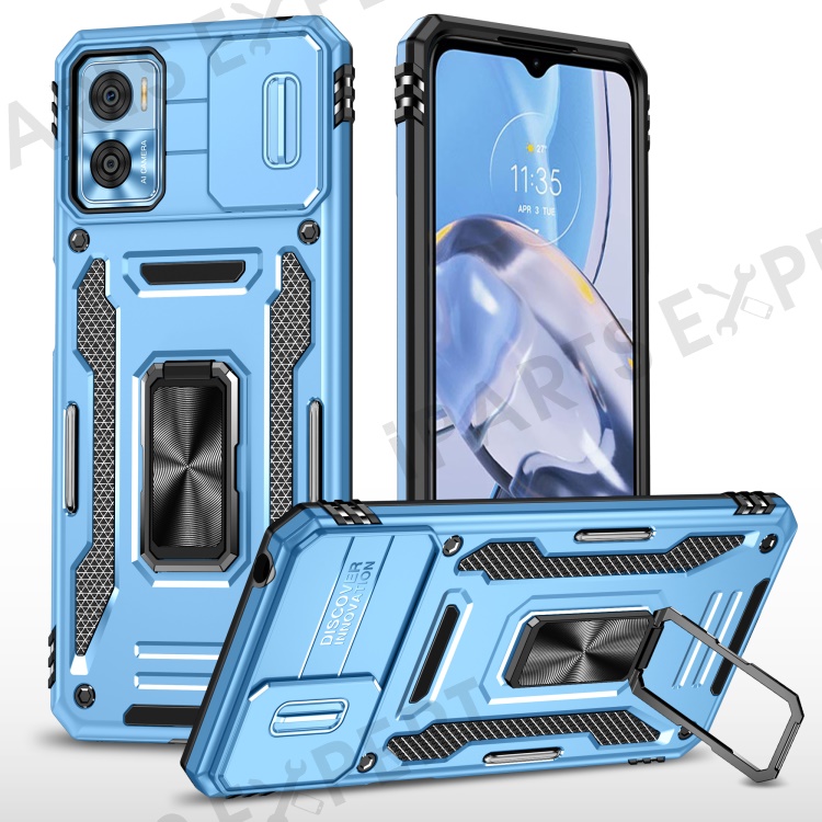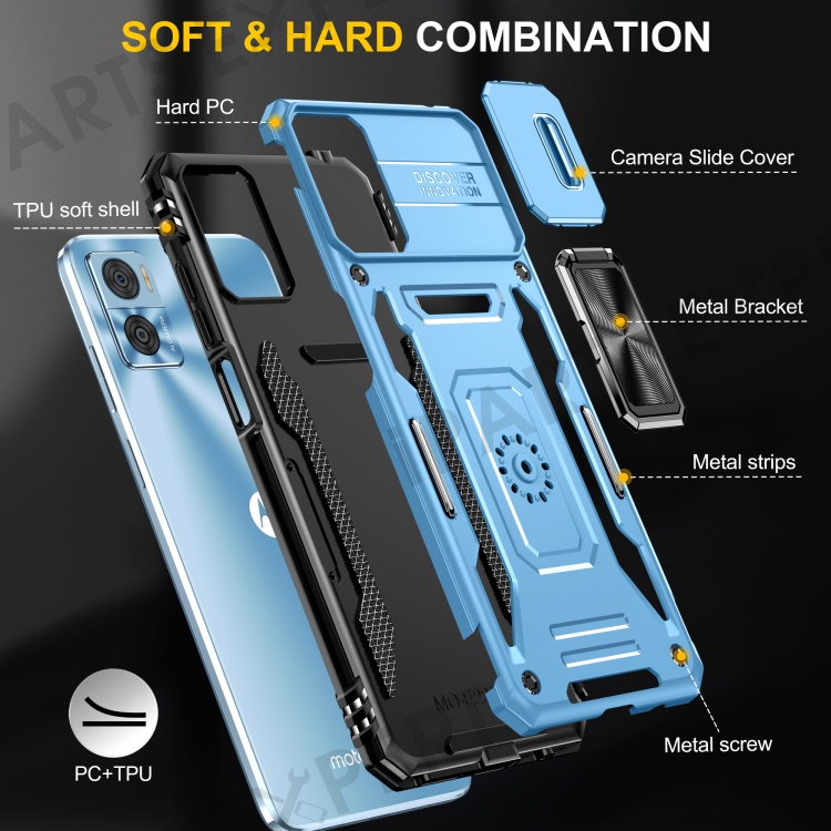 For Motorola Moto E22 4G Armor Series PC+TPU Cover Slide Lens Lid Phone Case with Kickstand - Light Blue