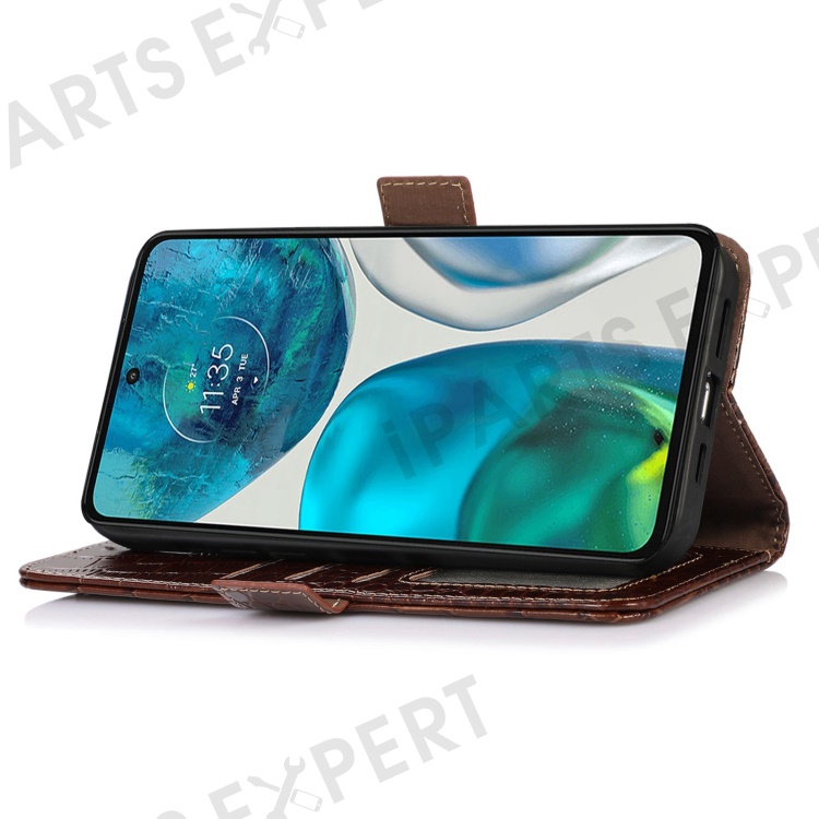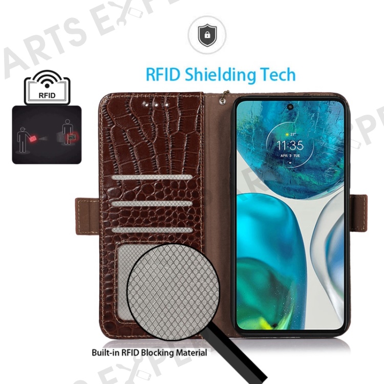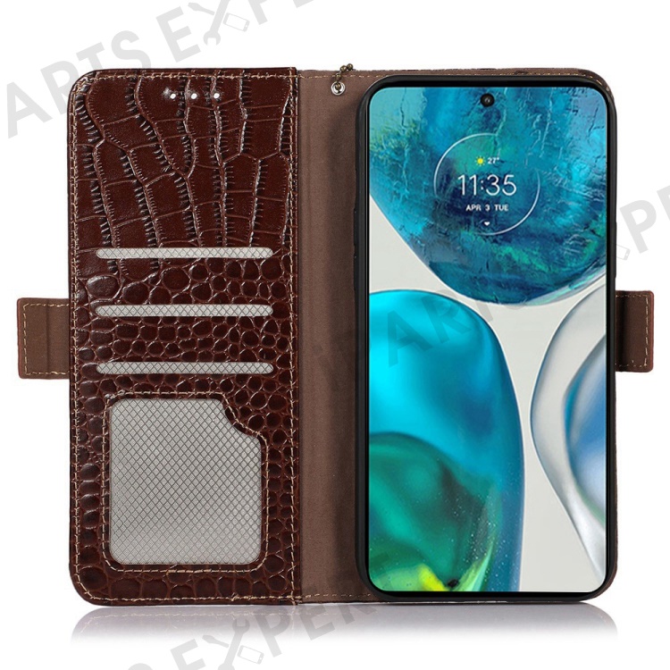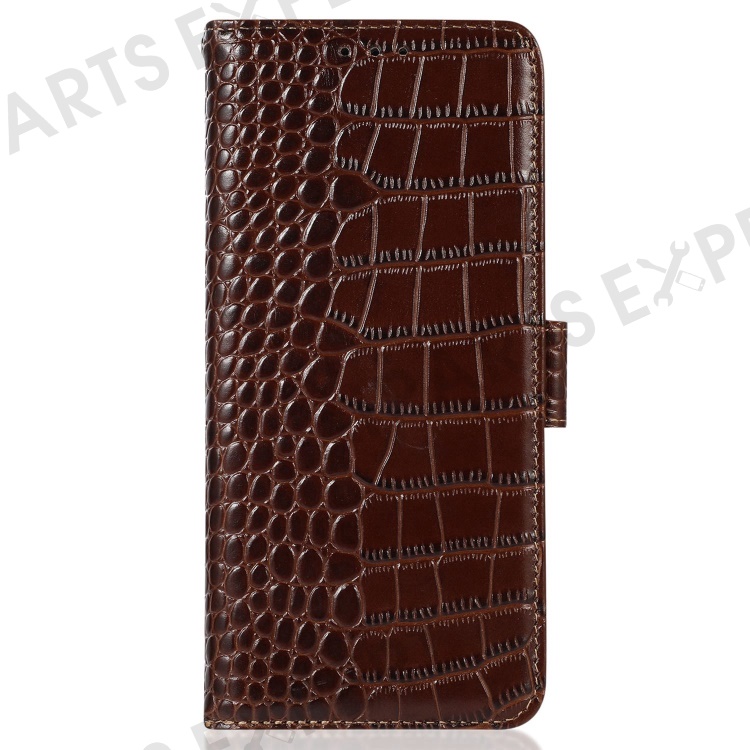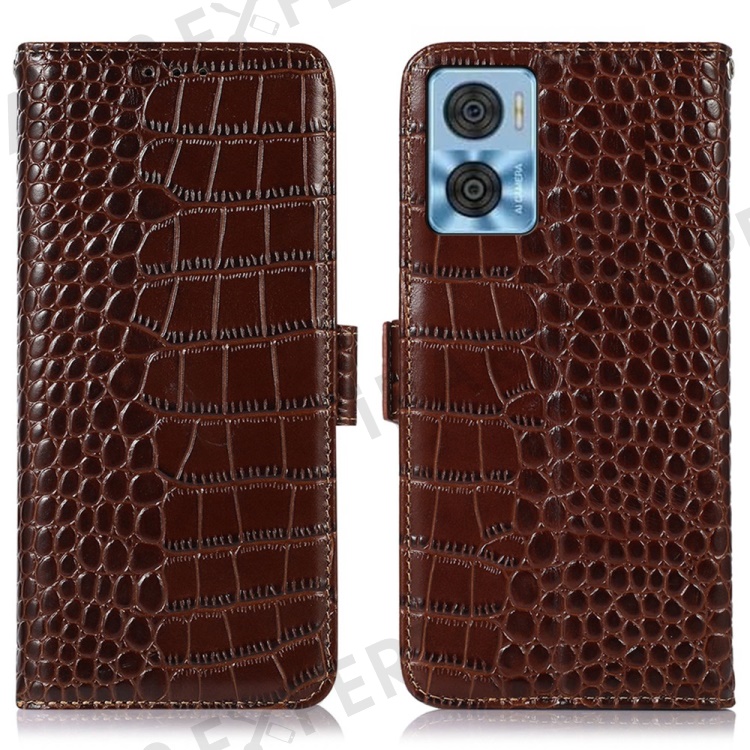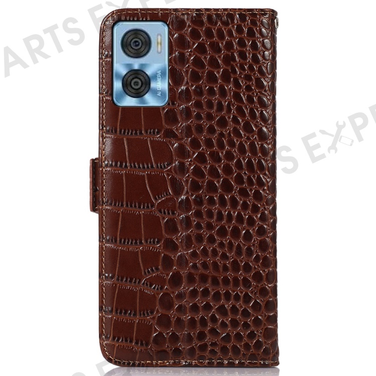 For Motorola Moto E22 4G / E22i 4G Genuine Cowhide Leather Flip Folio Case RFID Blocking Stand Crocodile Texture Wallet Phone Cover - Brown