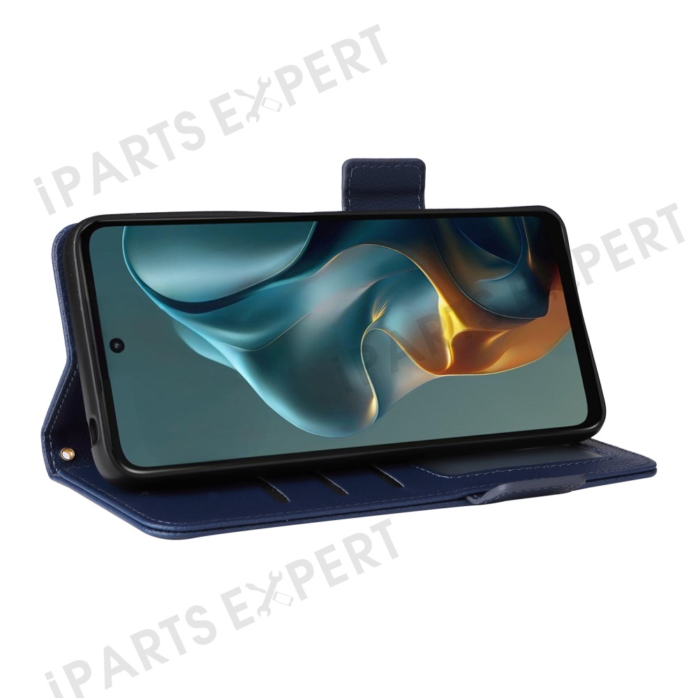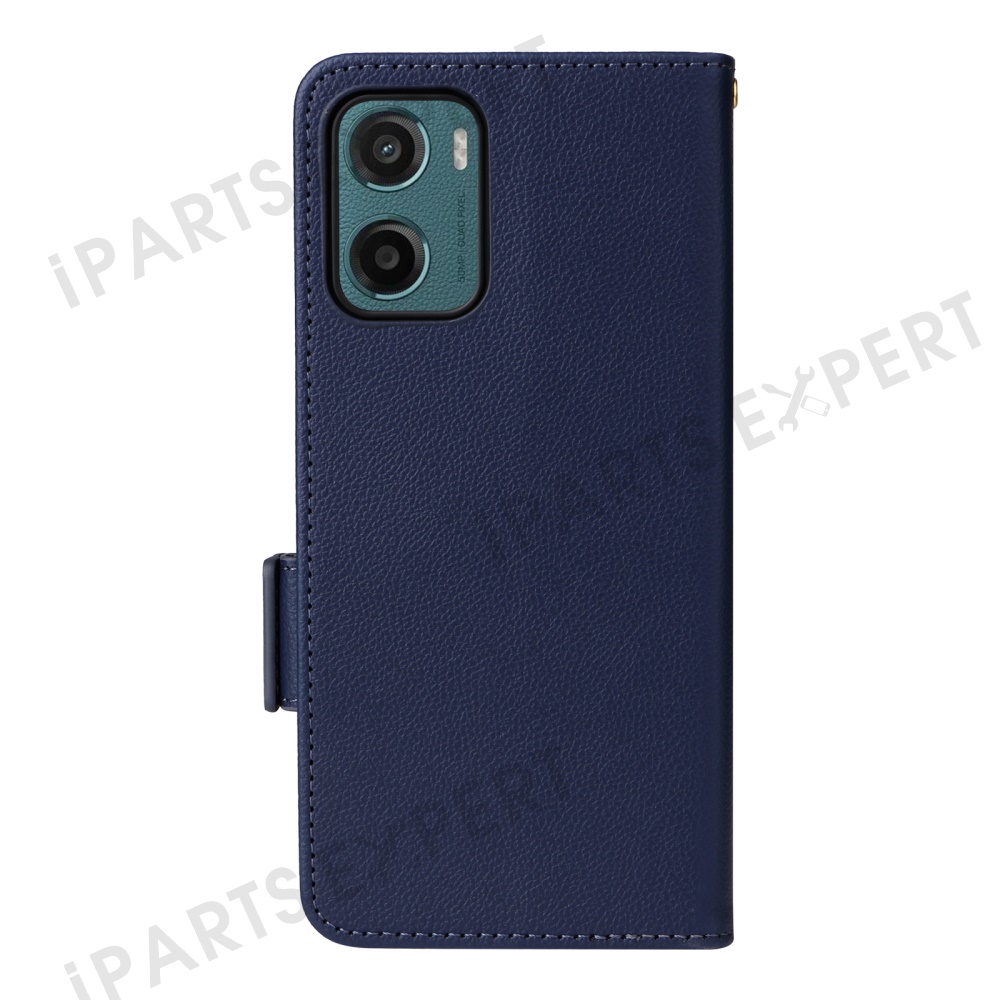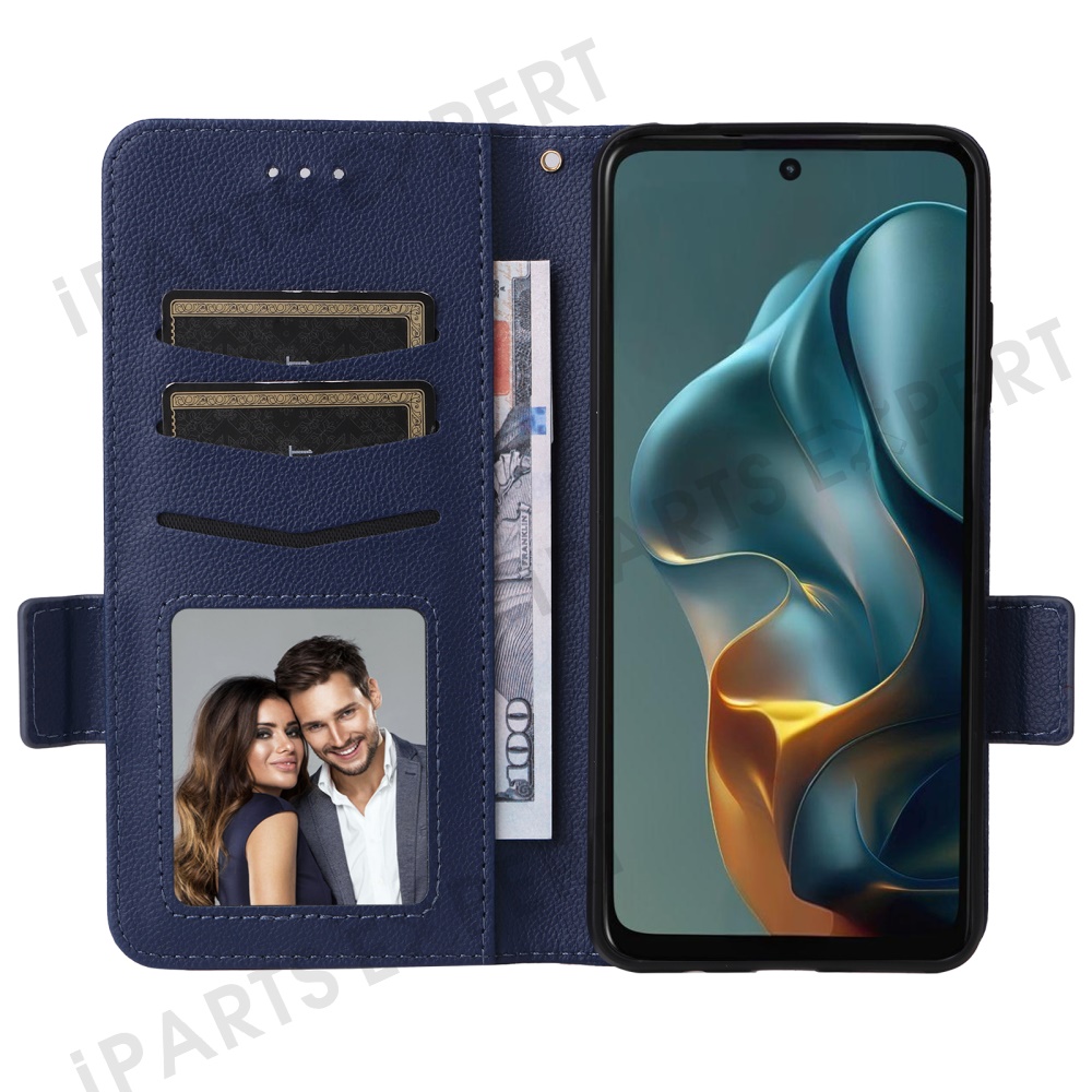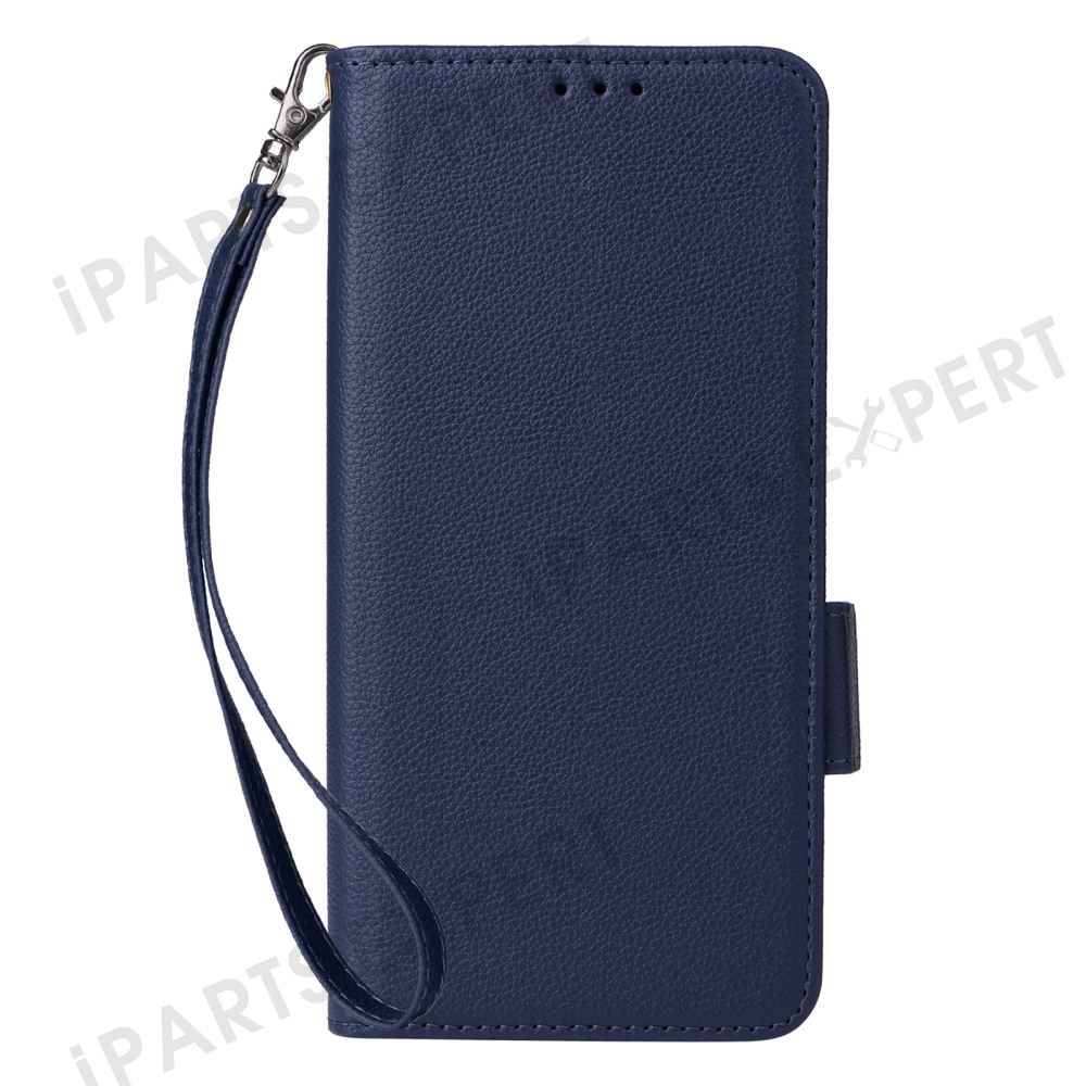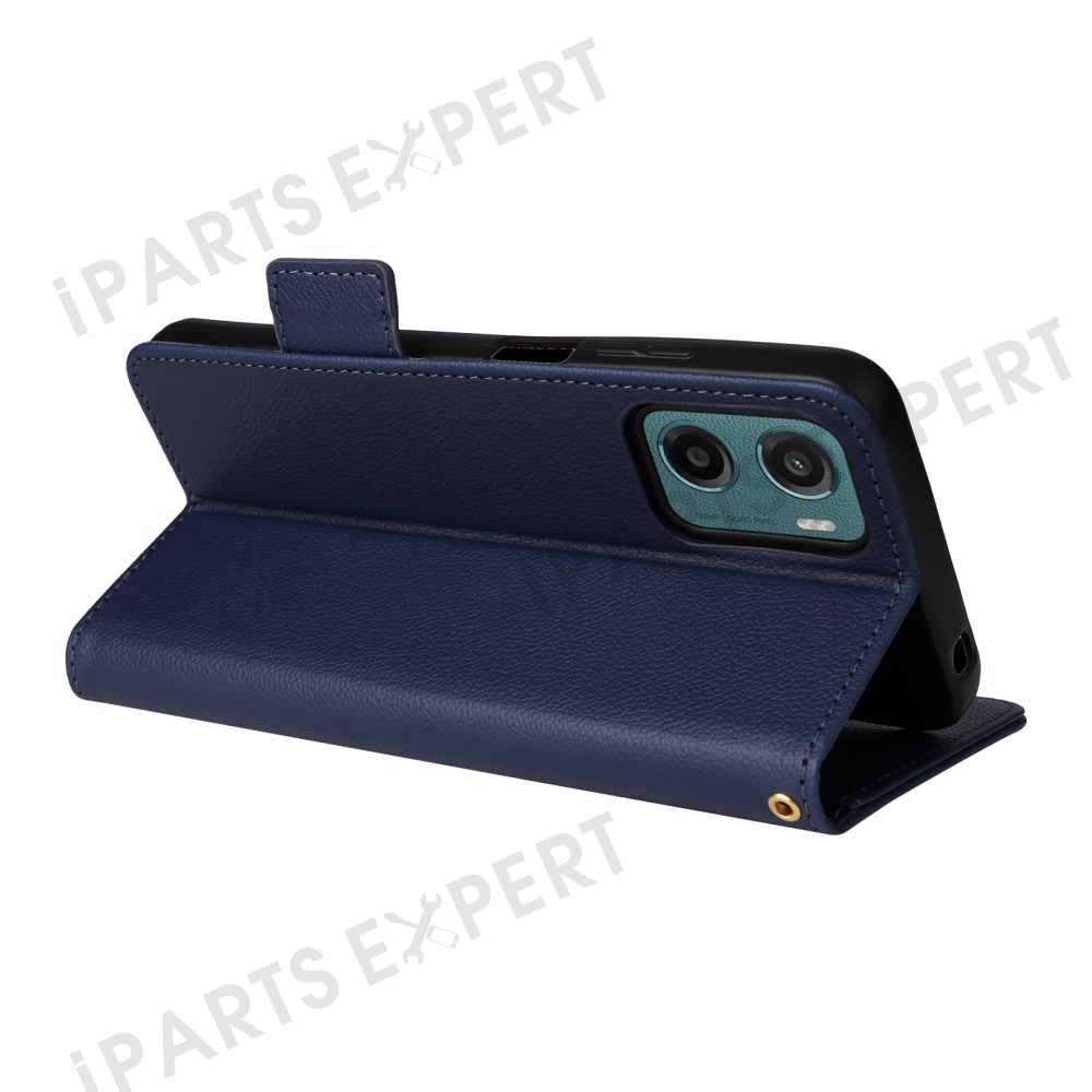For Motorola Moto G05 4G / E15 4G Case with Wrist Strap Litchi Texture PU Leather Wallet Phone Cover - Dark Blue