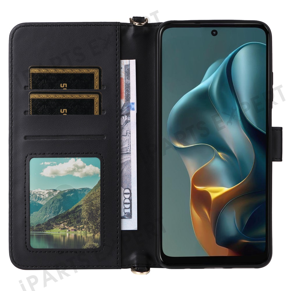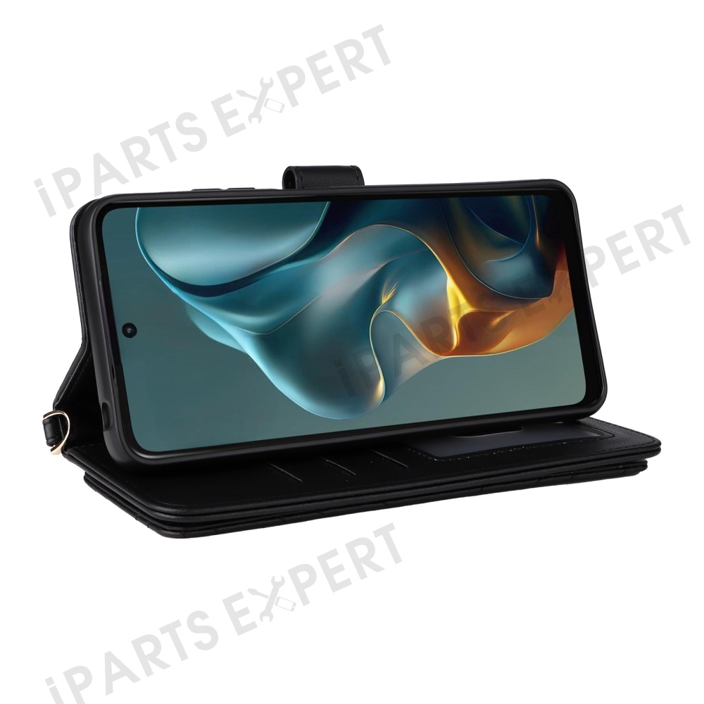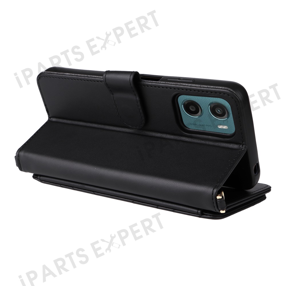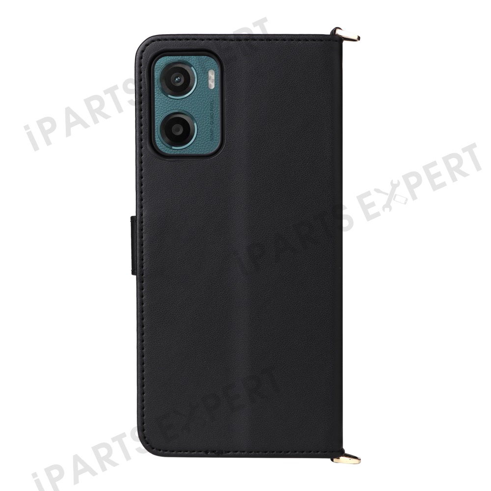 For Motorola Moto G05 4G / E15 4G Wallet Case with Shoulder / Wrist Strap Leather Phone Cover Stand - Black
