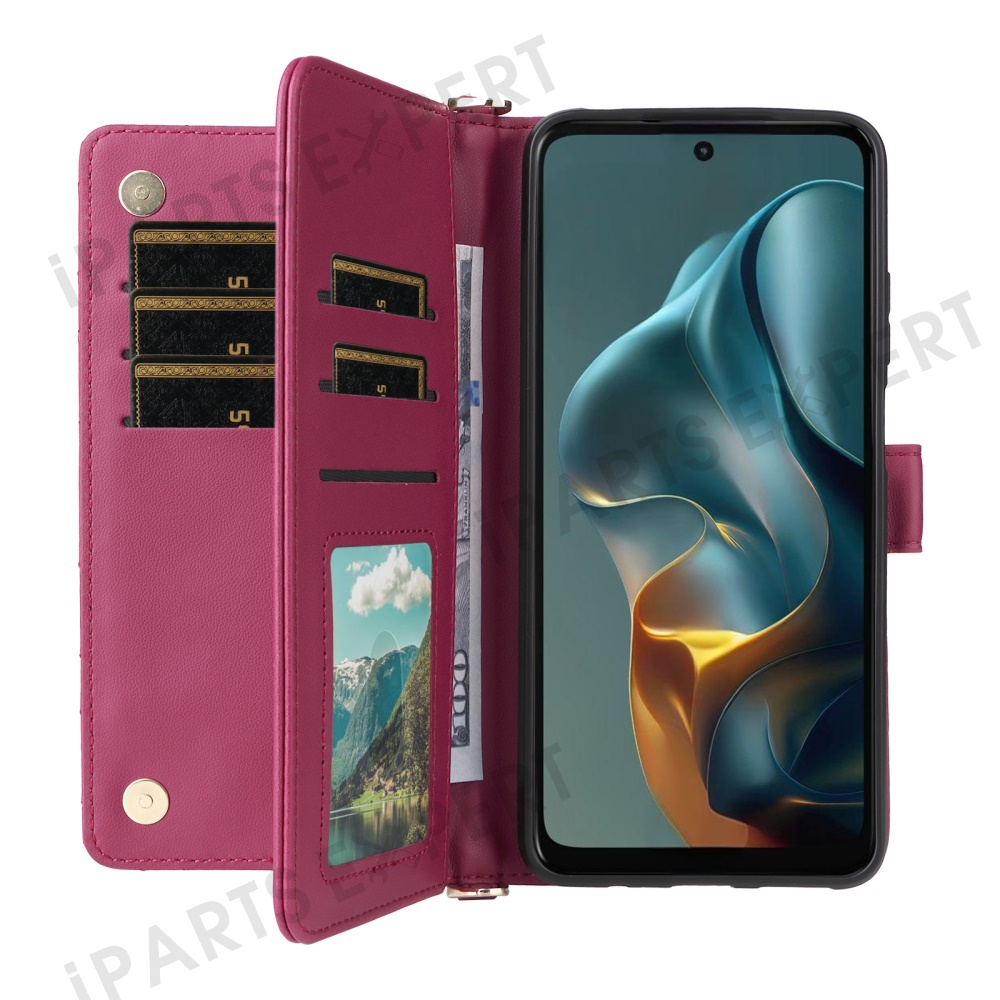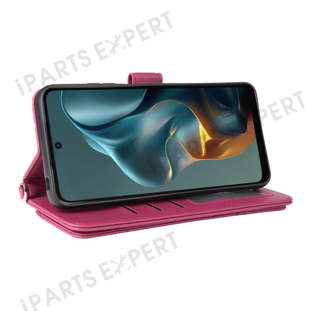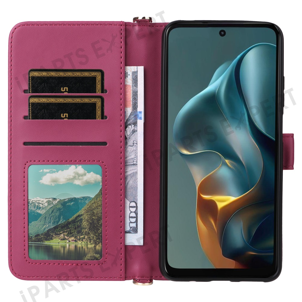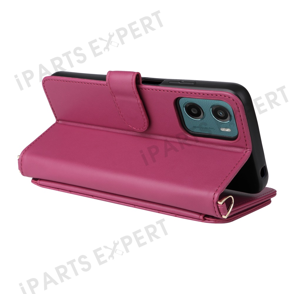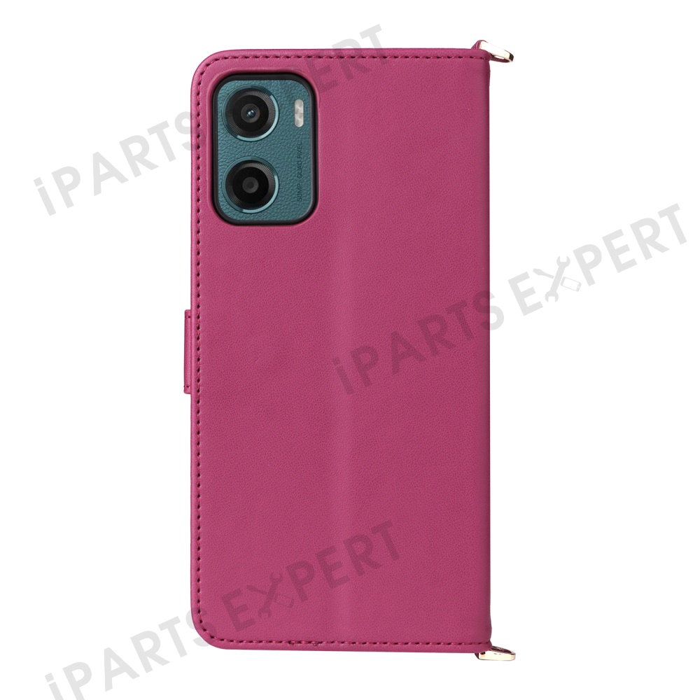 For Motorola Moto G05 4G / E15 4G Wallet Case with Shoulder / Wrist Strap Leather Phone Cover Stand - Rose