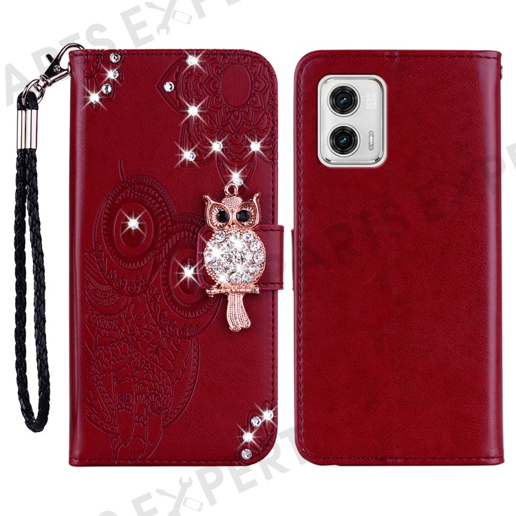 For Motorola Moto G13 4G / G23 4G / G53 5G Rhinestone Imprinted Owl Flower Phone Case PU Leather Stand Flip Folio Wallet Cover - Red