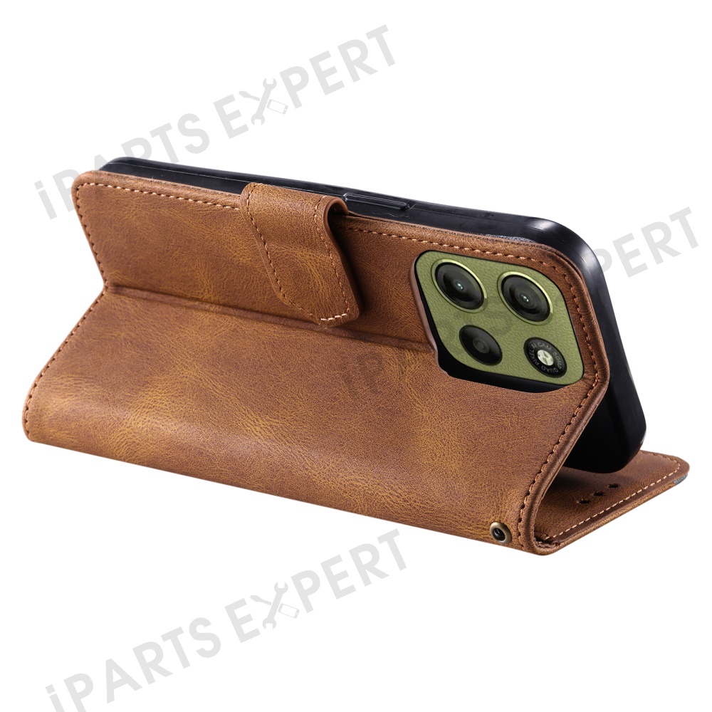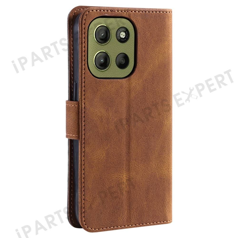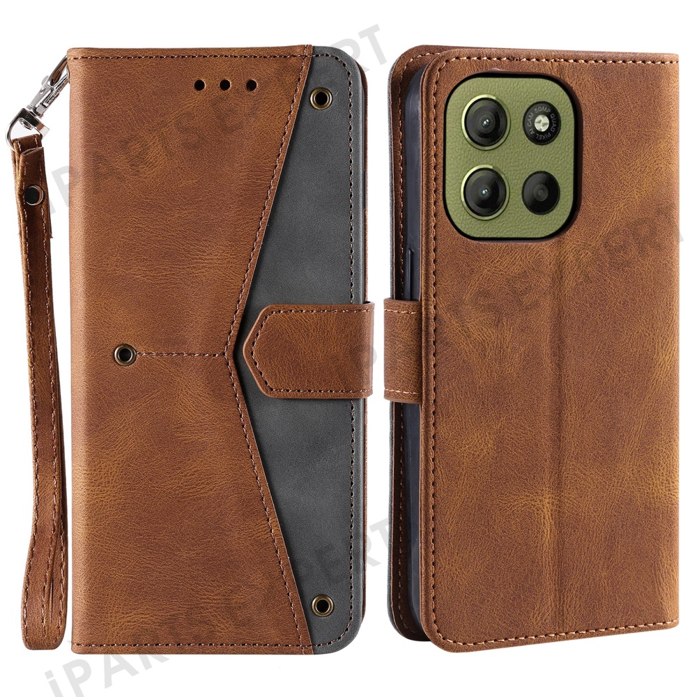 For Motorola Moto G17 Power 4G / G17 4G / G15 Power 4G / G15 4G Leather Case Splicing Stitching Wallet Stand Phone Cover with Strap - Brown