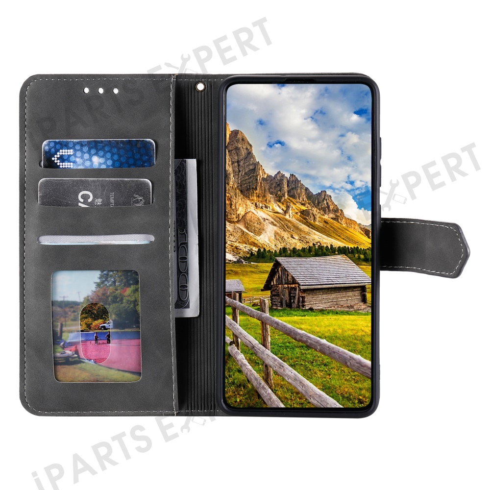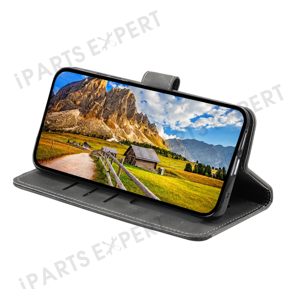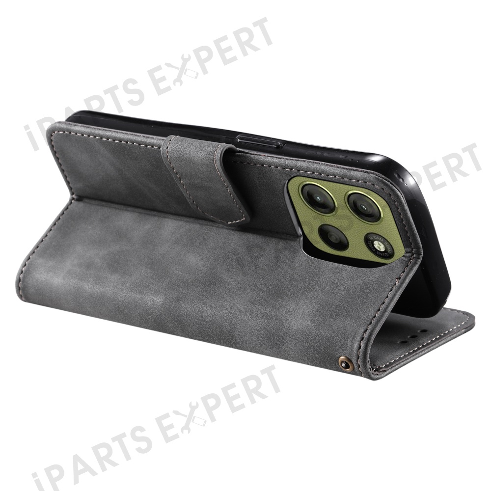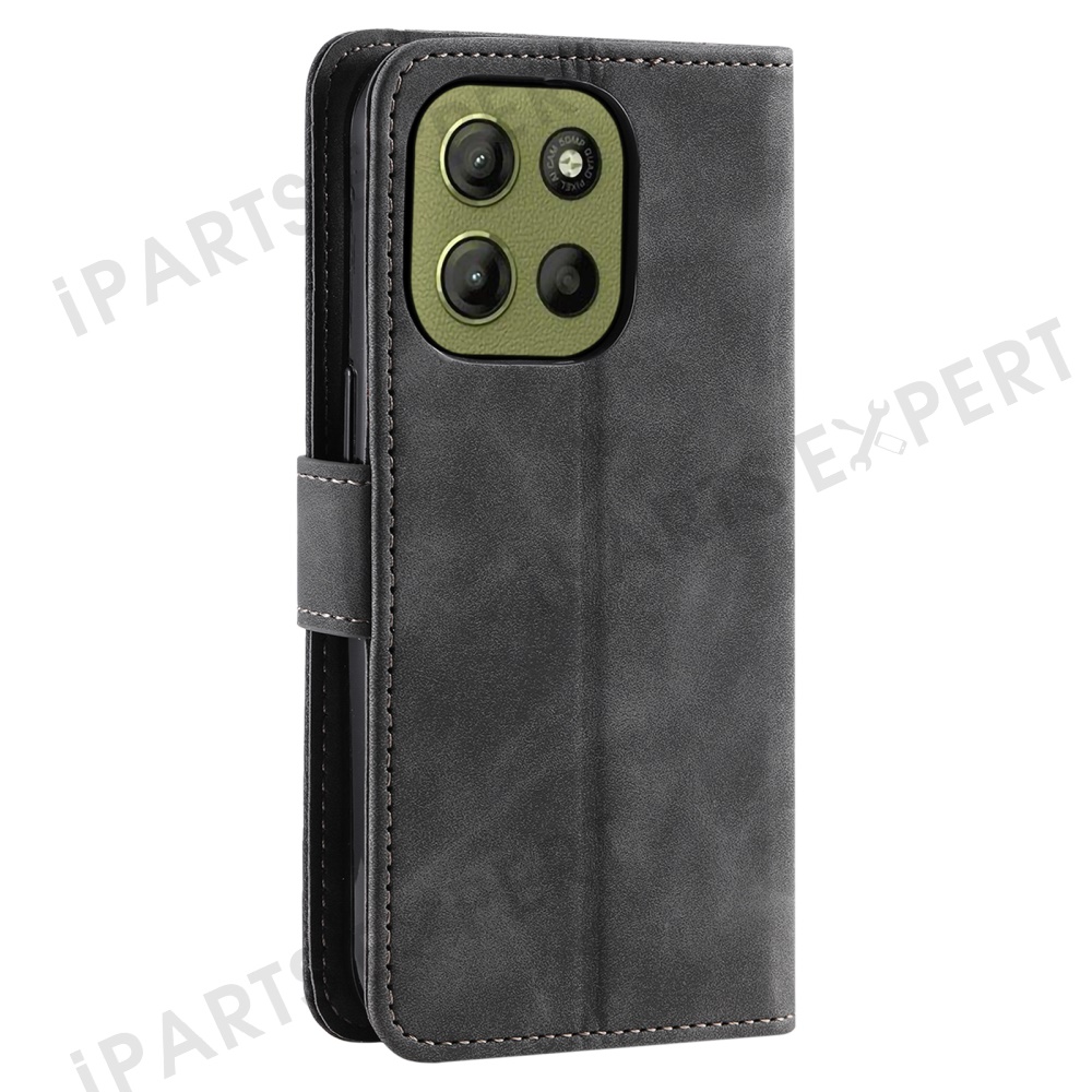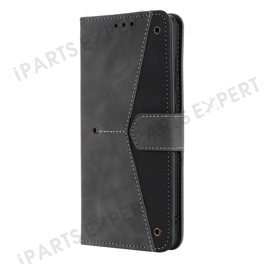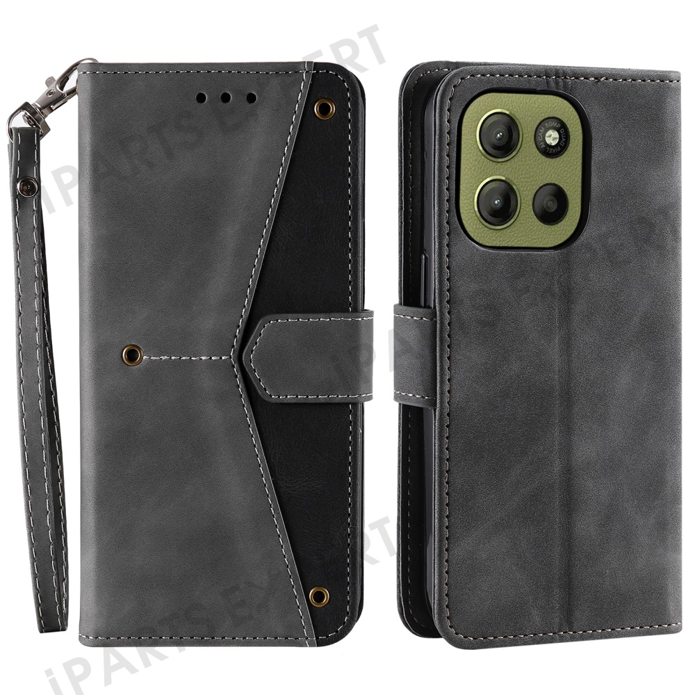 For Motorola Moto G17 Power 4G / G17 4G / G15 Power 4G / G15 4G Leather Case Splicing Stitching Wallet Stand Phone Cover with Strap - Grey