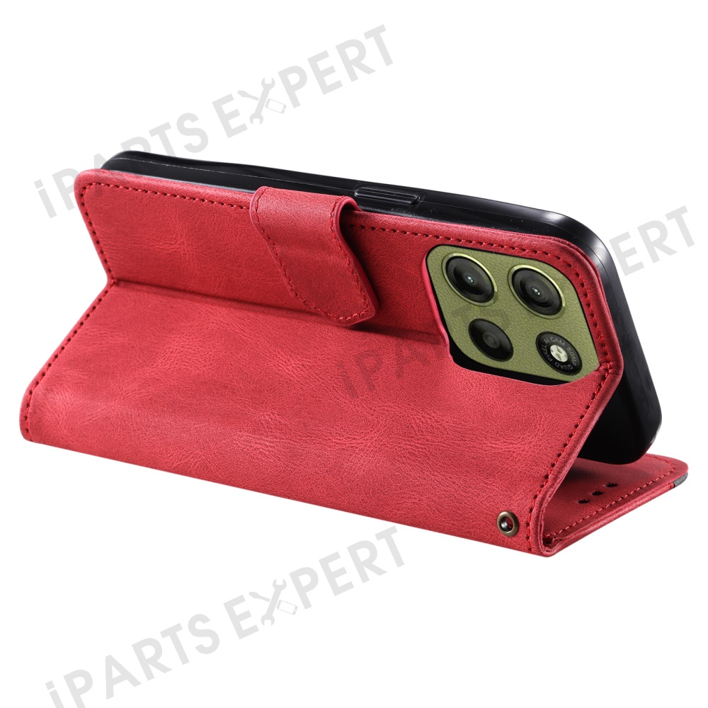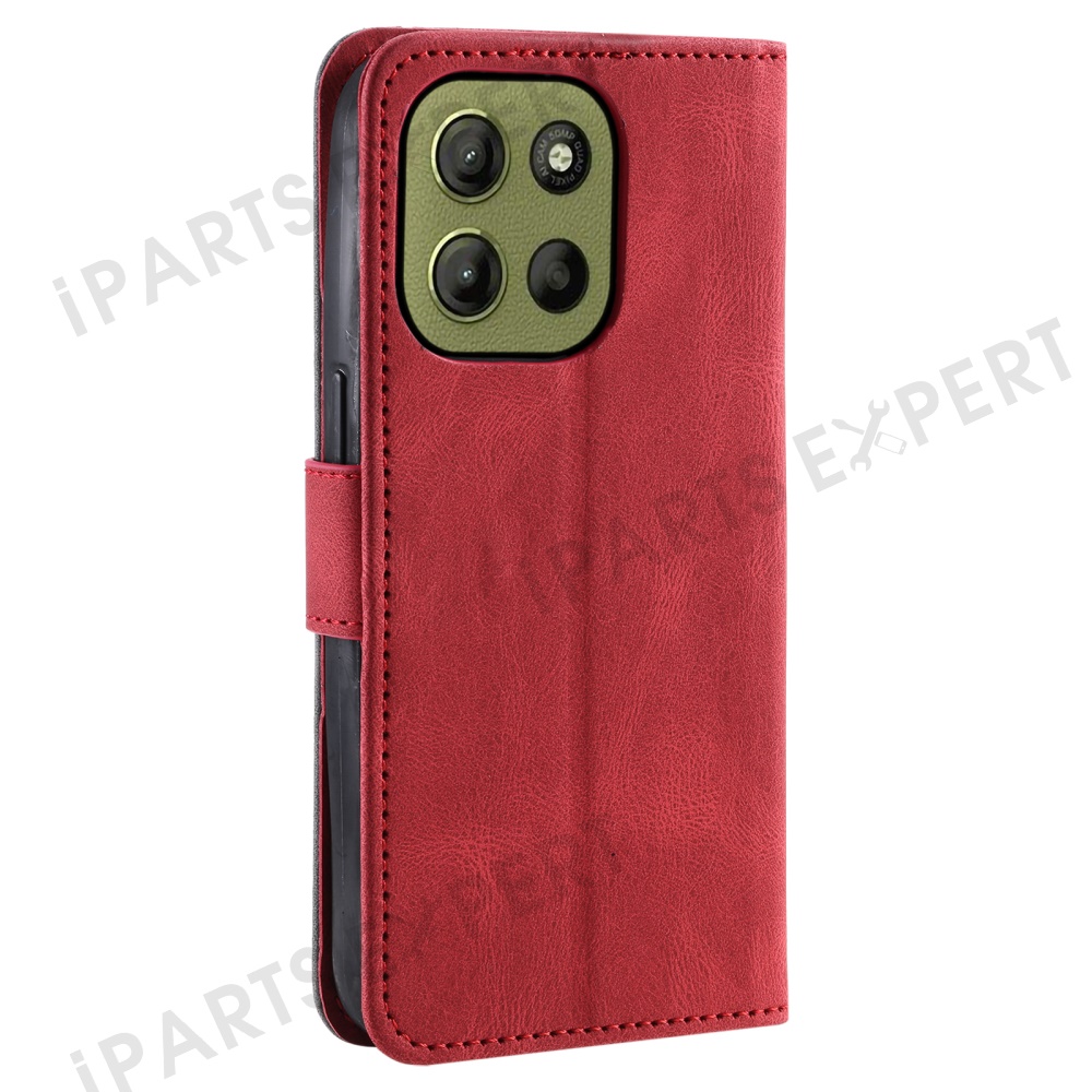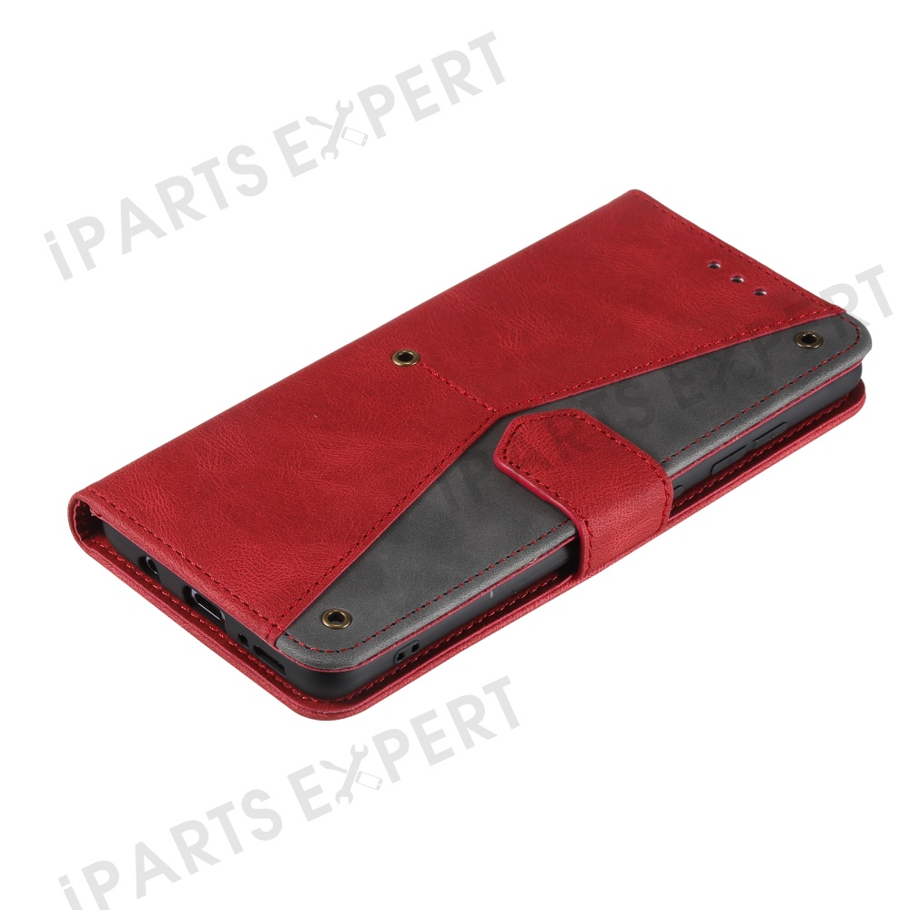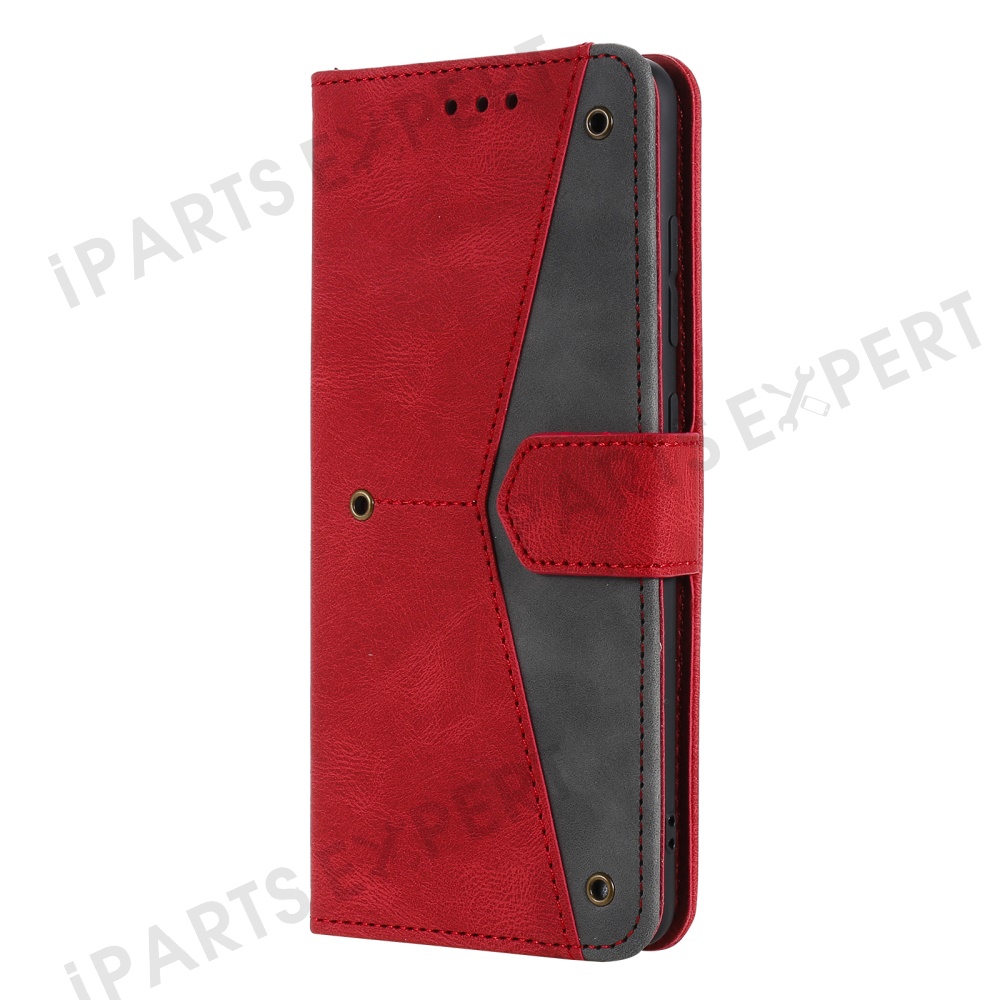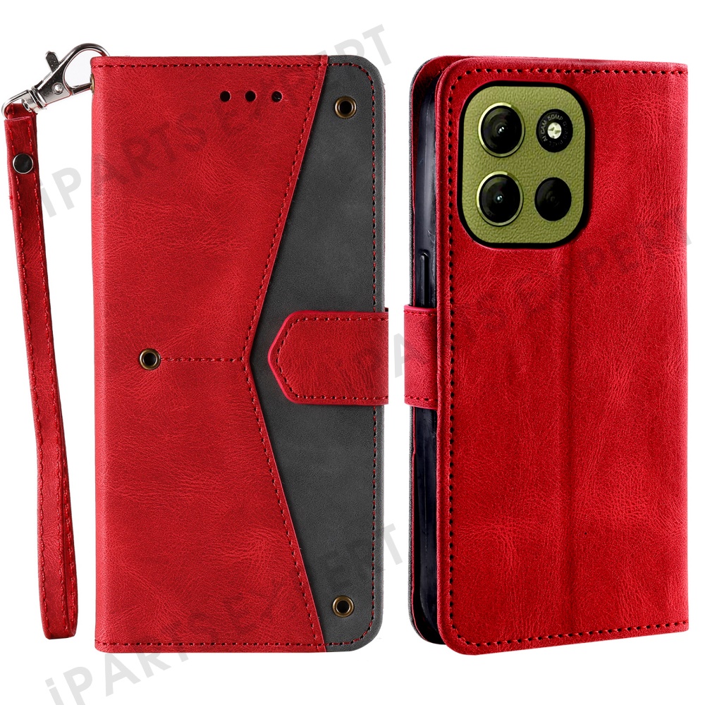 For Motorola Moto G17 Power 4G / G17 4G / G15 Power 4G / G15 4G Leather Case Splicing Stitching Wallet Stand Phone Cover with Strap - Red