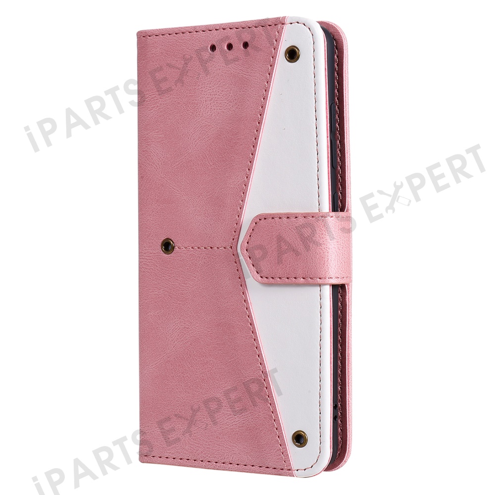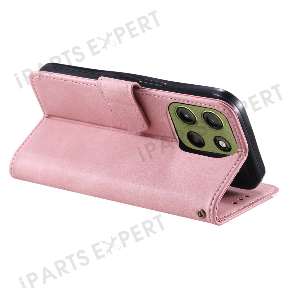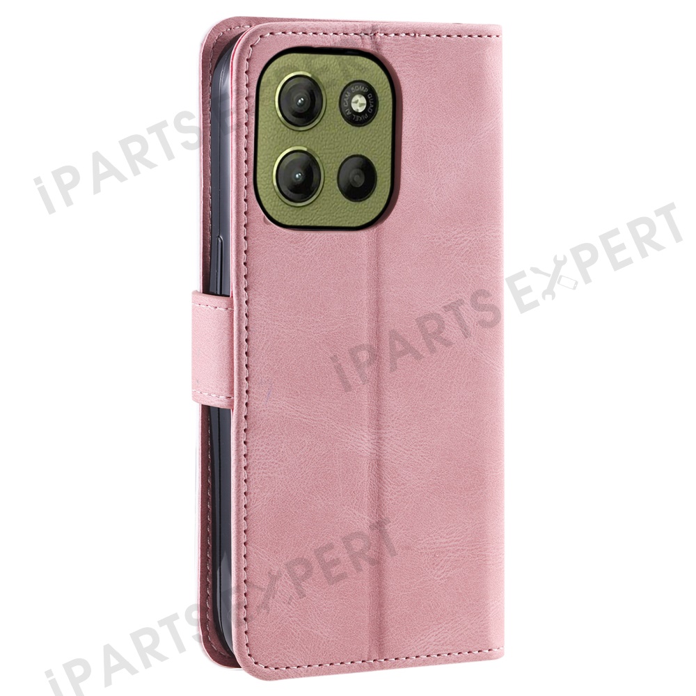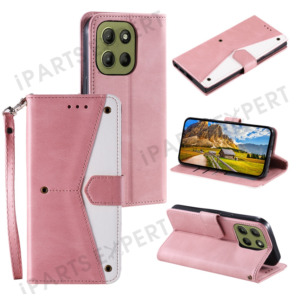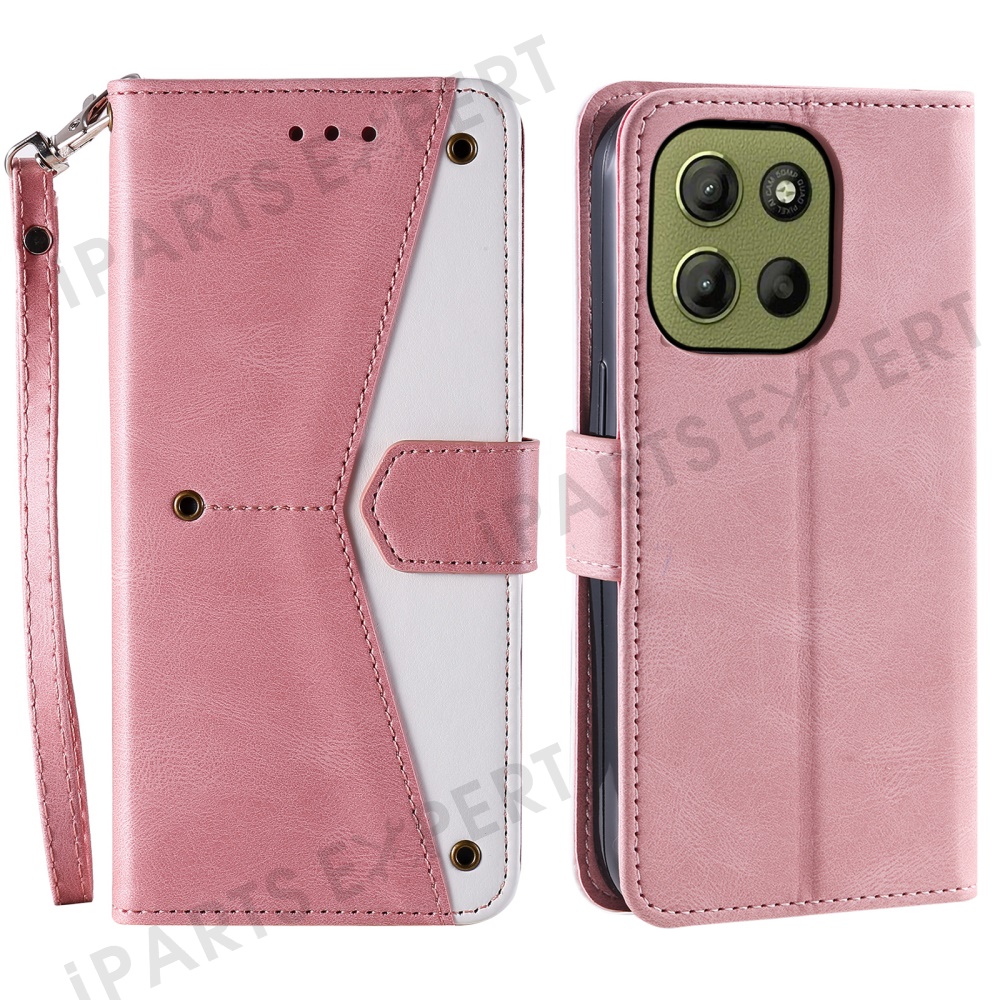 For Motorola Moto G17 Power 4G / G17 4G / G15 Power 4G / G15 4G Leather Case Splicing Stitching Wallet Stand Phone Cover with Strap - Rose Gold