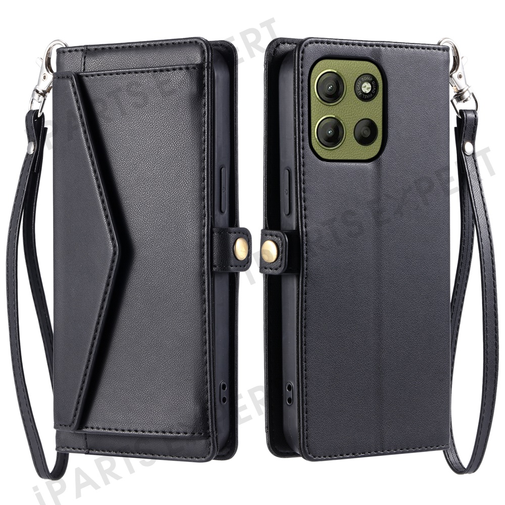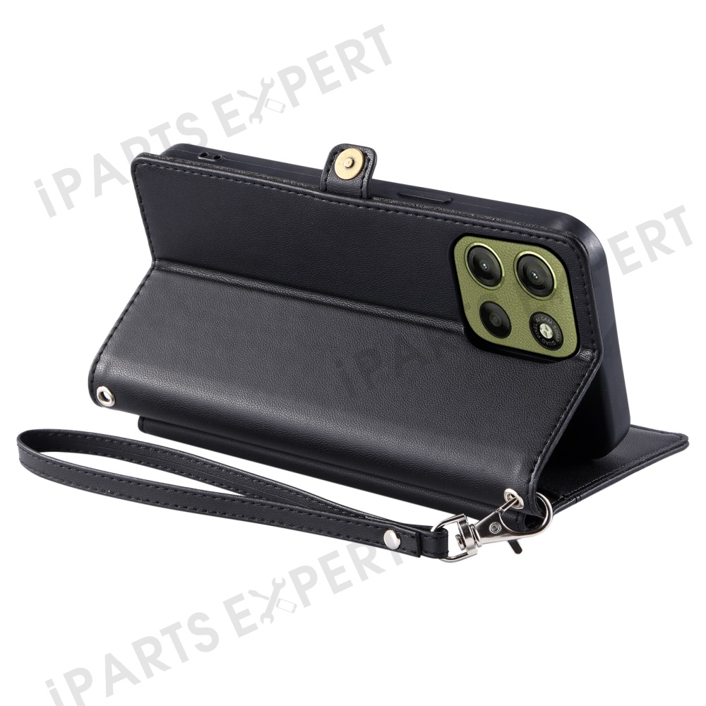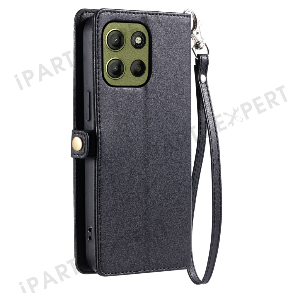 For Motorola Moto G15 4G Leather Case Wallet Stand Phone Cover with Straps - Black