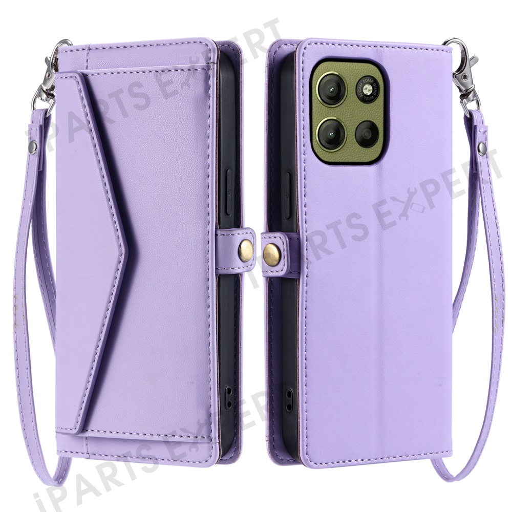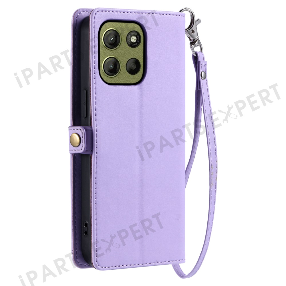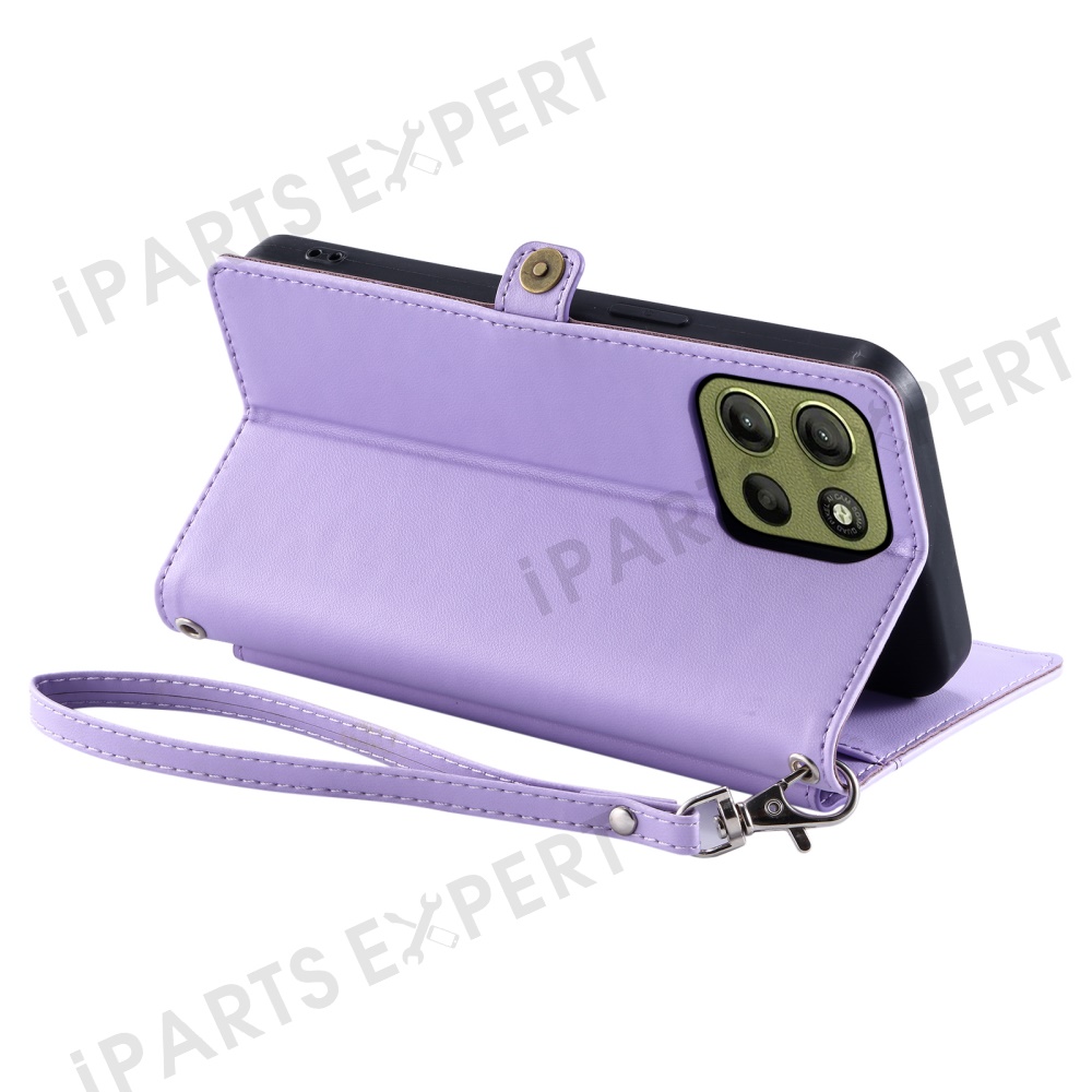 For Motorola Moto G15 4G Leather Case Wallet Stand Phone Cover with Straps - Purple