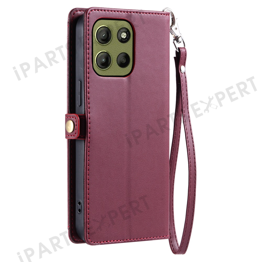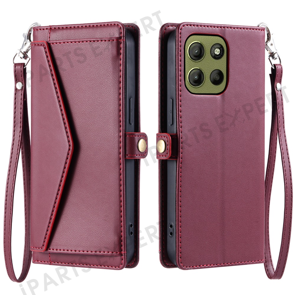 For Motorola Moto G15 4G Leather Case Wallet Stand Phone Cover with Straps - Wine Red