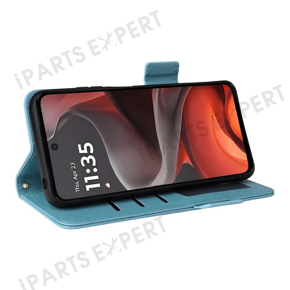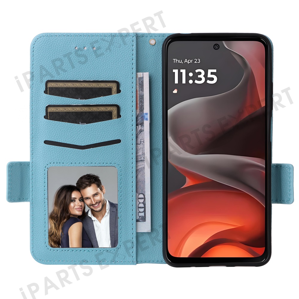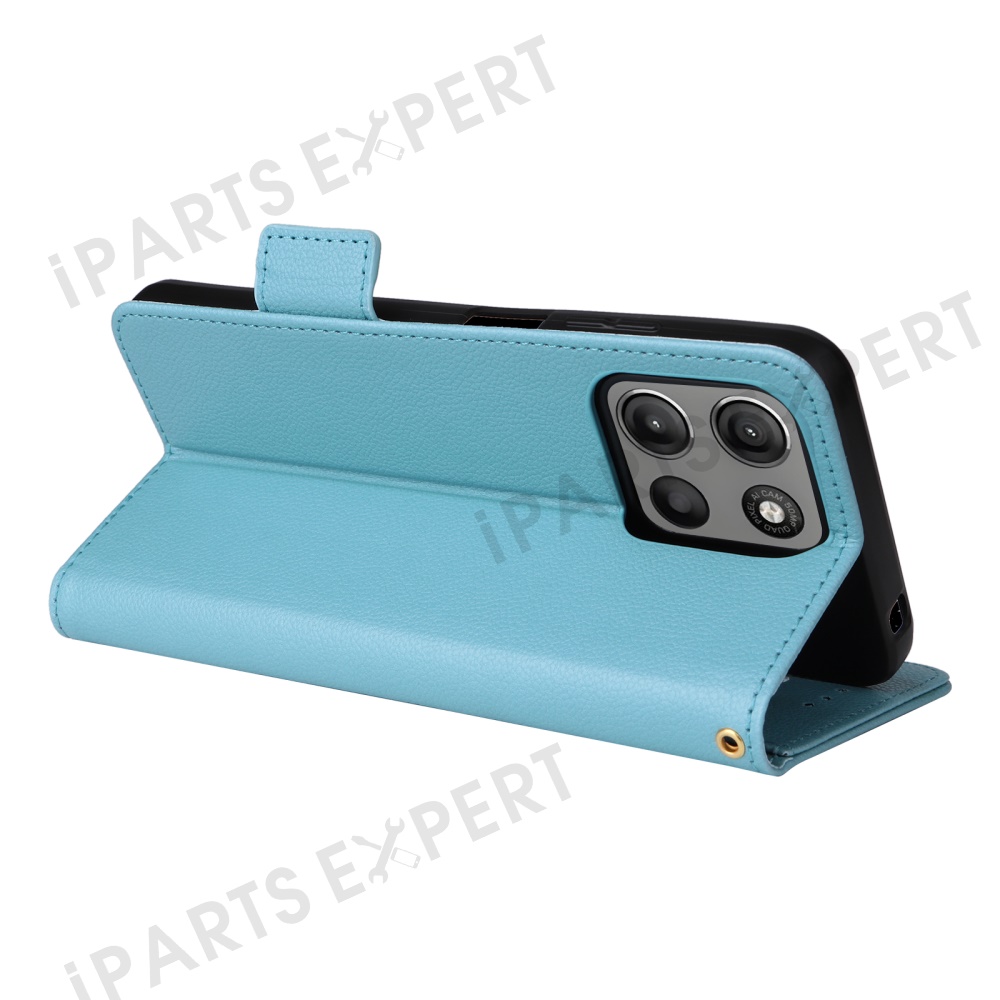 For Motorola Moto G15 Power 4G / G15 4G Case with Wrist Strap Litchi Texture PU Leather Wallet Phone Cover - Baby Blue