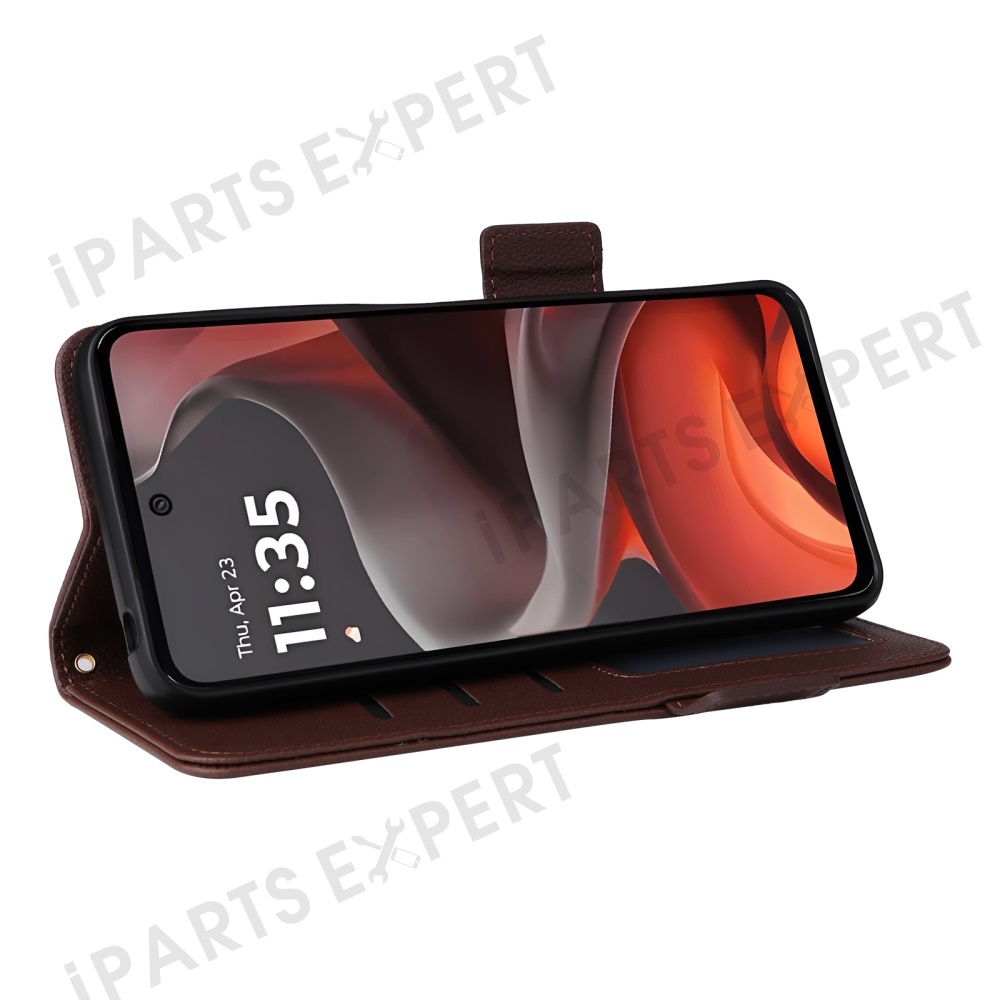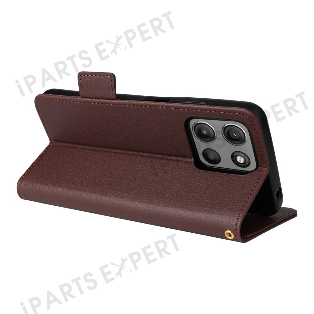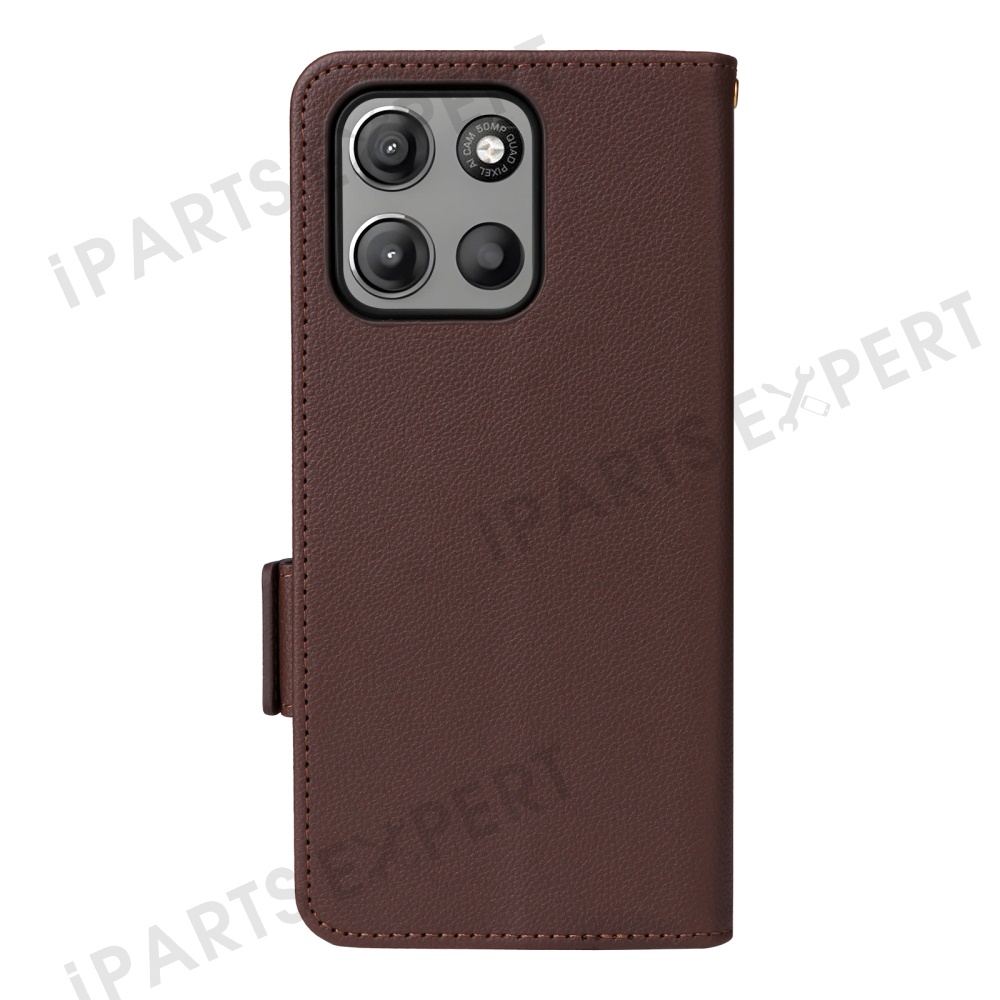 For Motorola Moto G15 Power 4G / G15 4G Case with Wrist Strap Litchi Texture PU Leather Wallet Phone Cover - Brown