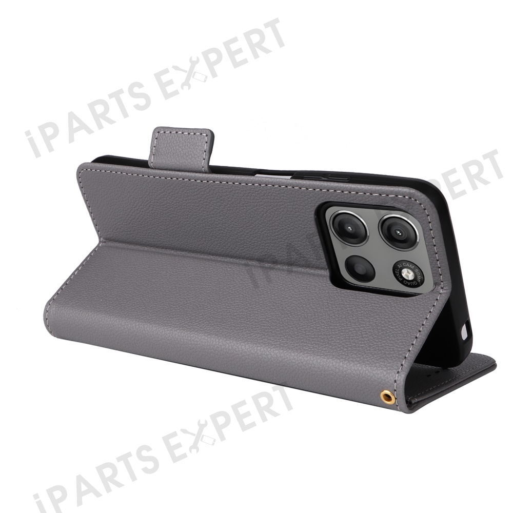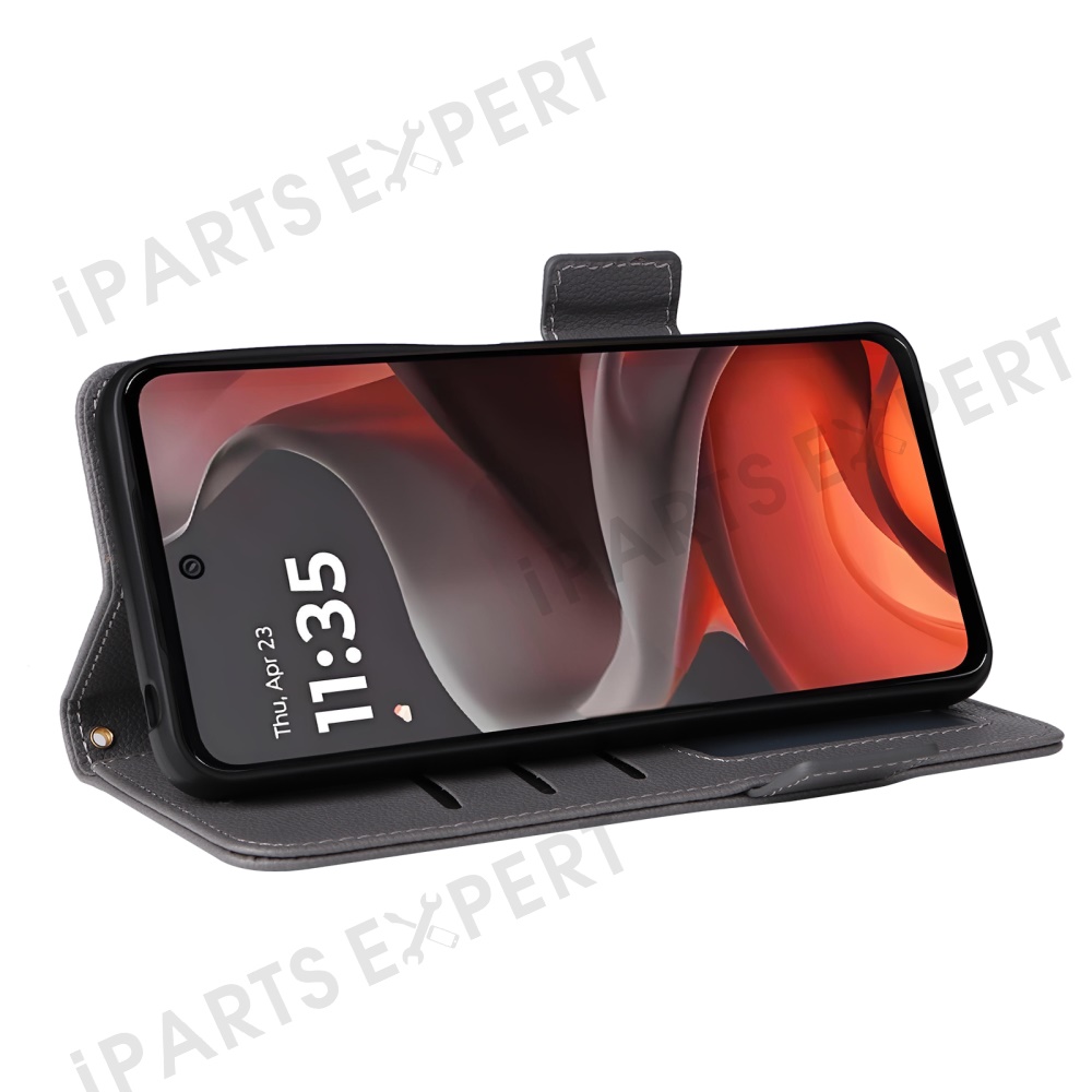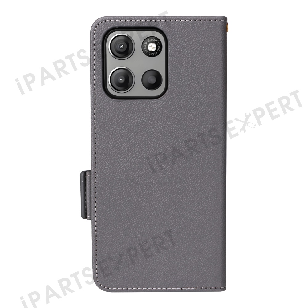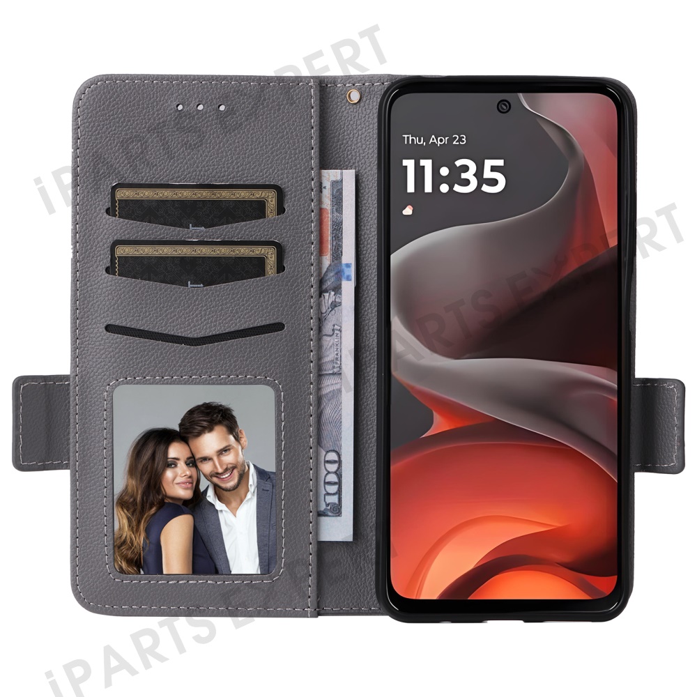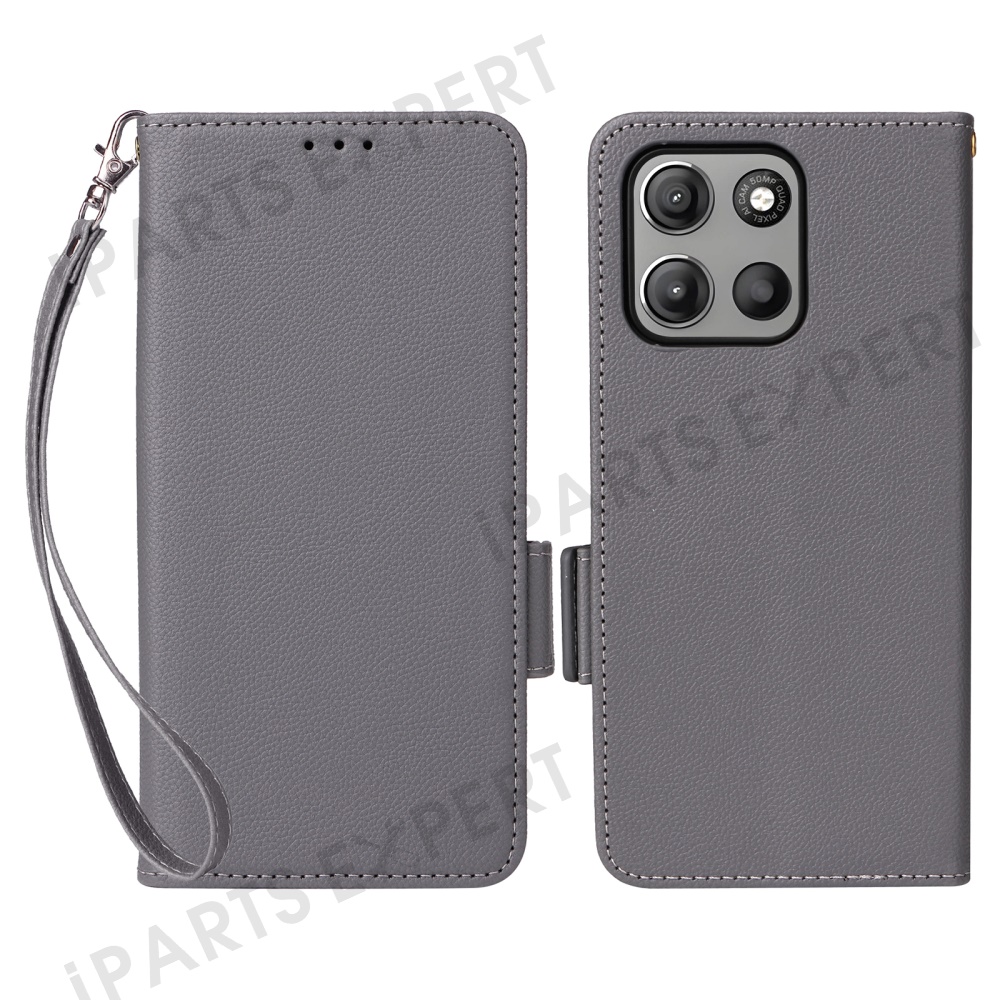 For Motorola Moto G15 Power 4G / G15 4G Case with Wrist Strap Litchi Texture PU Leather Wallet Phone Cover - Grey