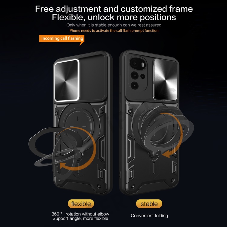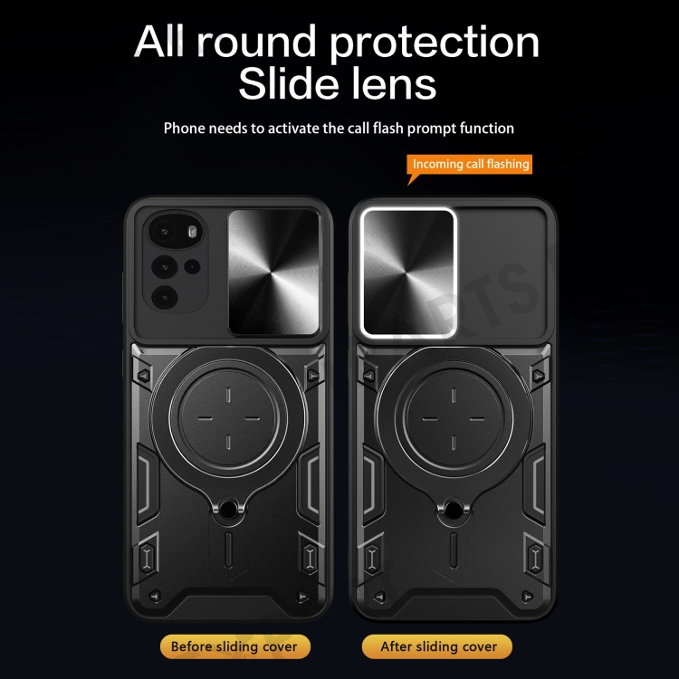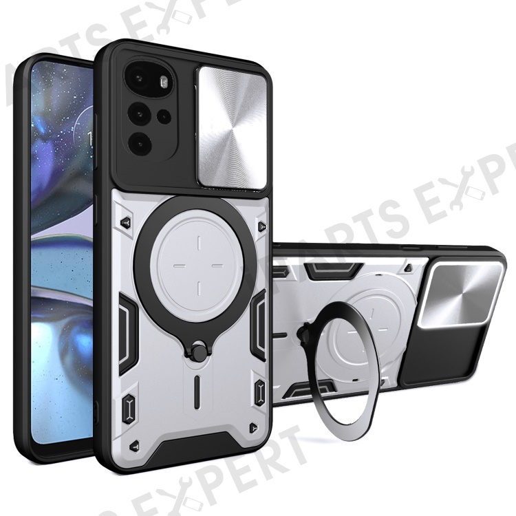 For Motorola Moto G22 / E32 4G PC+TPU Cover with Slide Camera Lid Ring Kickstand Phone Back Protector Case - Silver
