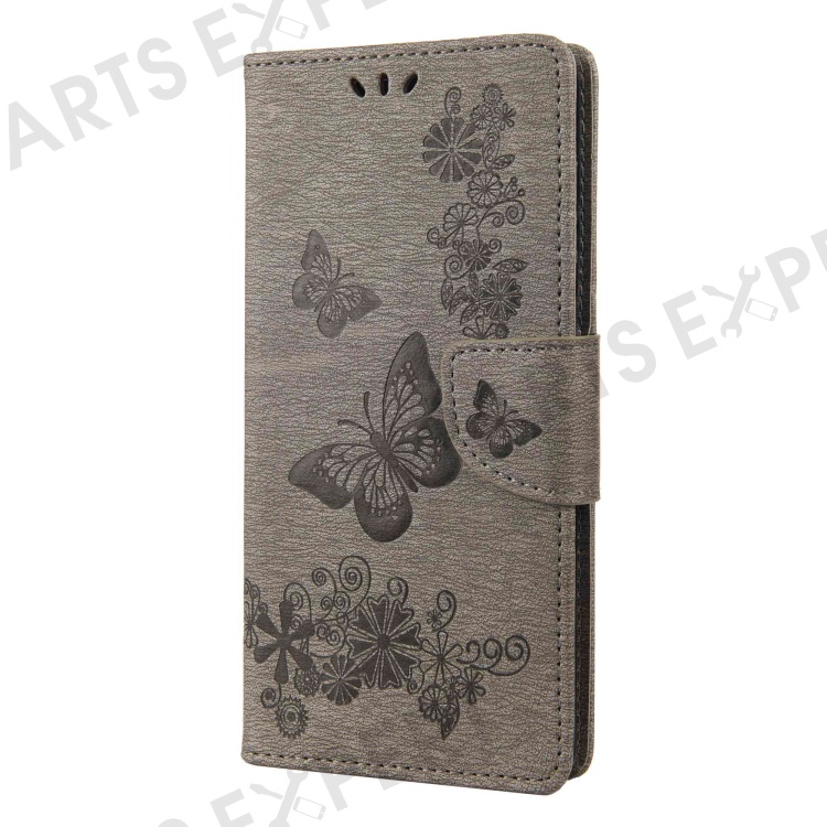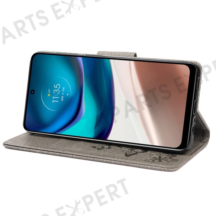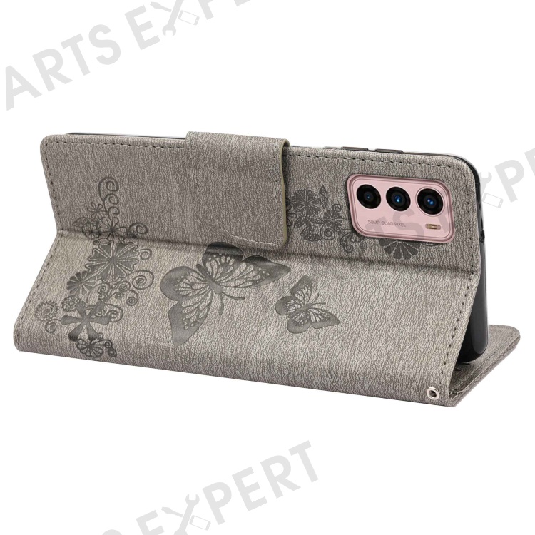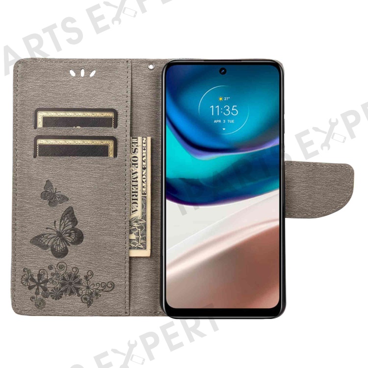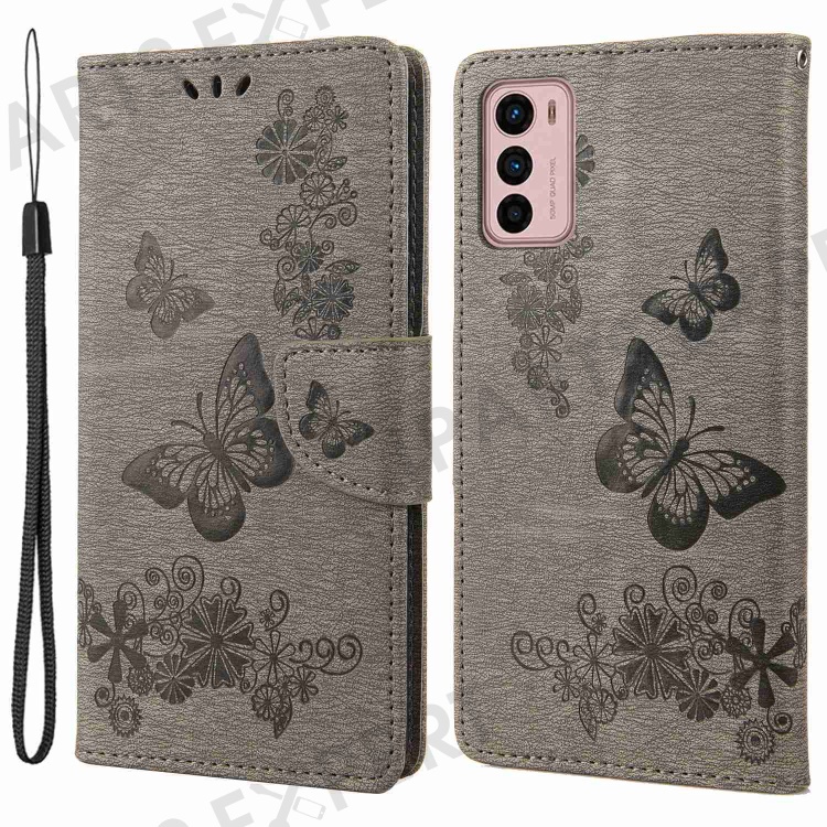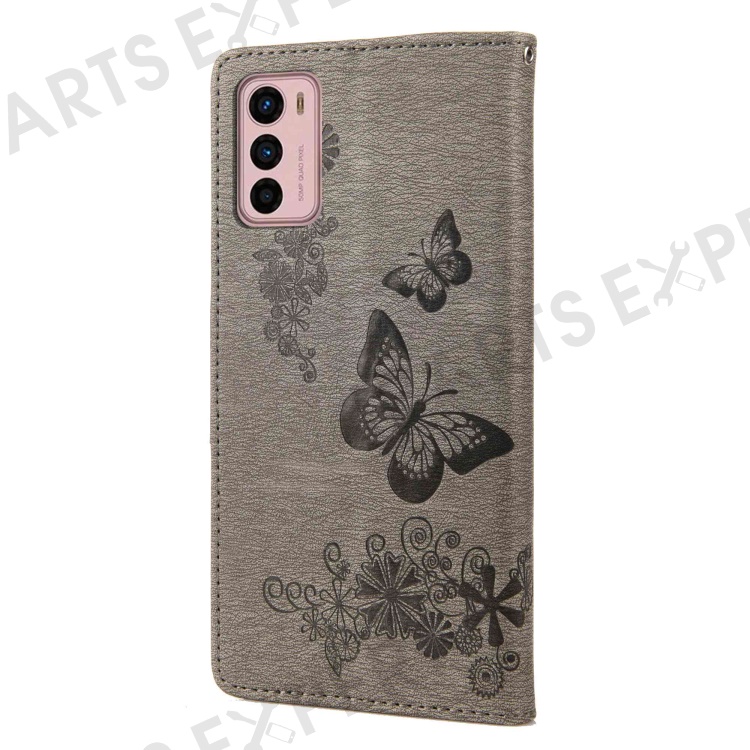 For Motorola Moto G42 4G PU Leather Case Big Butterflies Flower Pattern Imprinting Full Protection Stand Wallet Cover with Strap - Grey