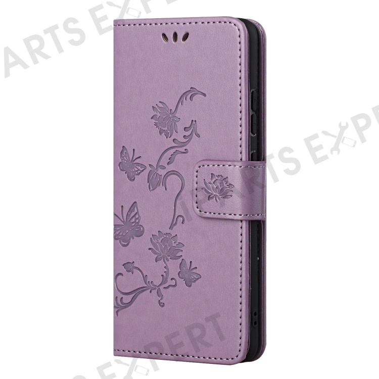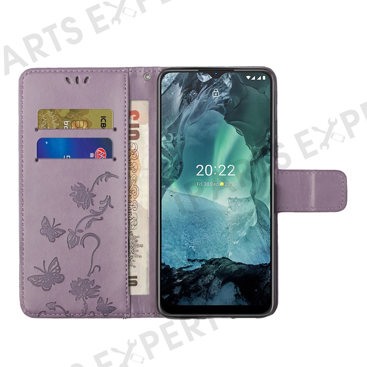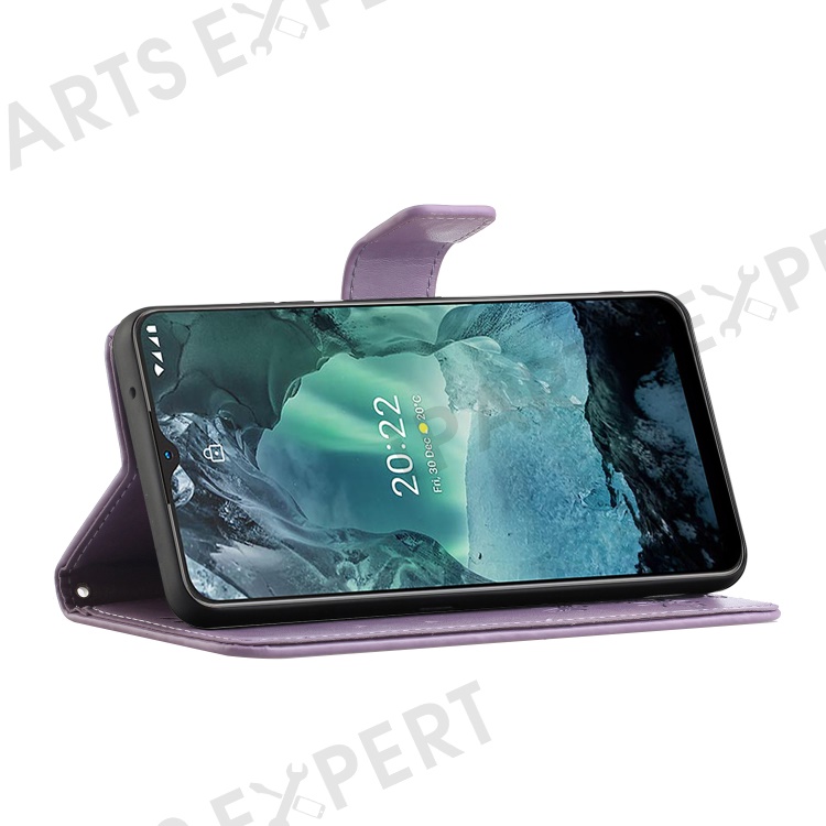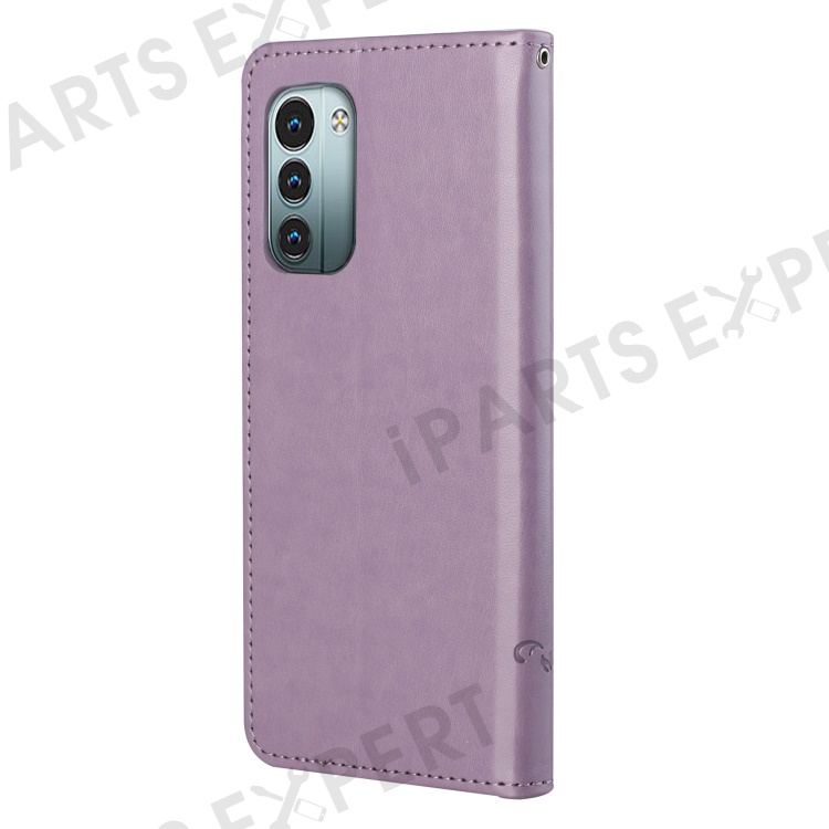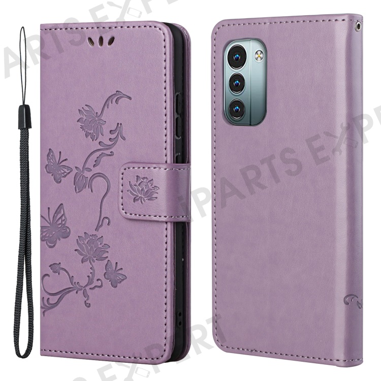 For Nokia G21/G11 Wrist Strap Anti-fall Butterfly Flower Imprinted Phone Case Shockproof Stand PU Leather Wallet Cover - Purple