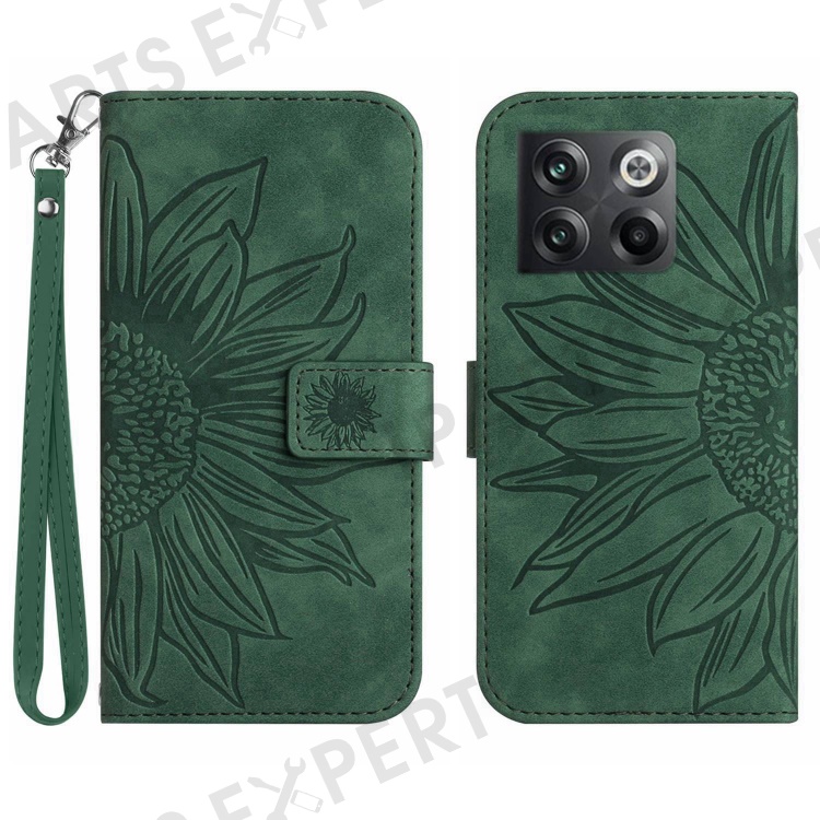 For OnePlus 10T 5G / Ace Pro 5G HT04 Sunflower Imprinted PU Leather Wallet Cover Skin-Touch Flip Stand Phone Drop-proof Case with Hand Strap - Dark Green