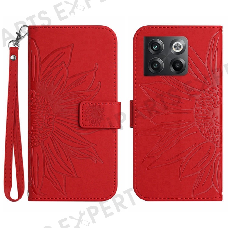 For OnePlus 10T 5G / Ace Pro 5G HT04 Sunflower Imprinted PU Leather Wallet Cover Skin-Touch Flip Stand Phone Drop-proof Case with Hand Strap - Red