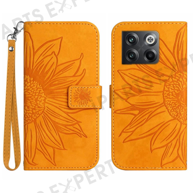 For OnePlus 10T 5G / Ace Pro 5G HT04 Sunflower Imprinted PU Leather Wallet Cover Skin-Touch Flip Stand Phone Drop-proof Case with Hand Strap - Yellow
