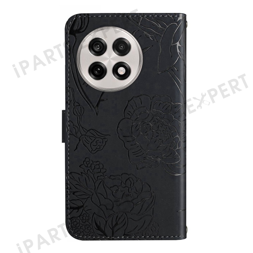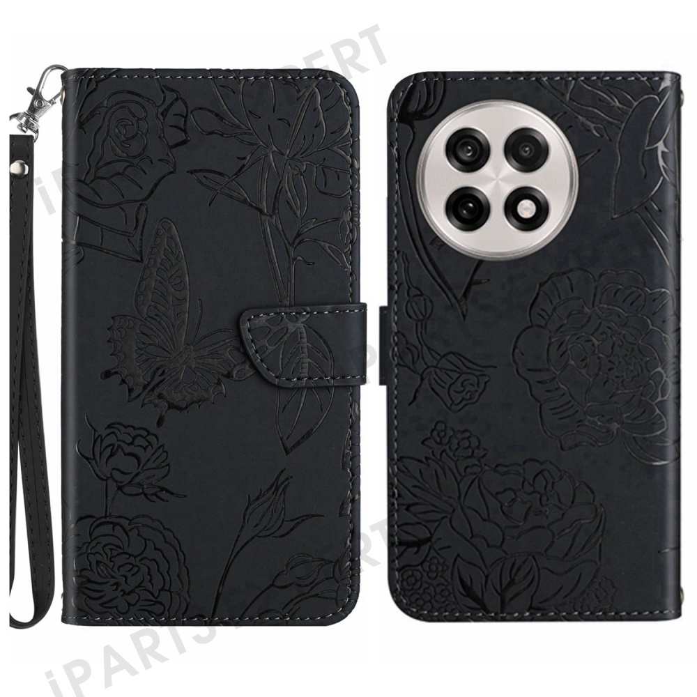 For OnePlus 13 Case Butterfly Flower Imprinted Leather Phone Cover with Strap - Black