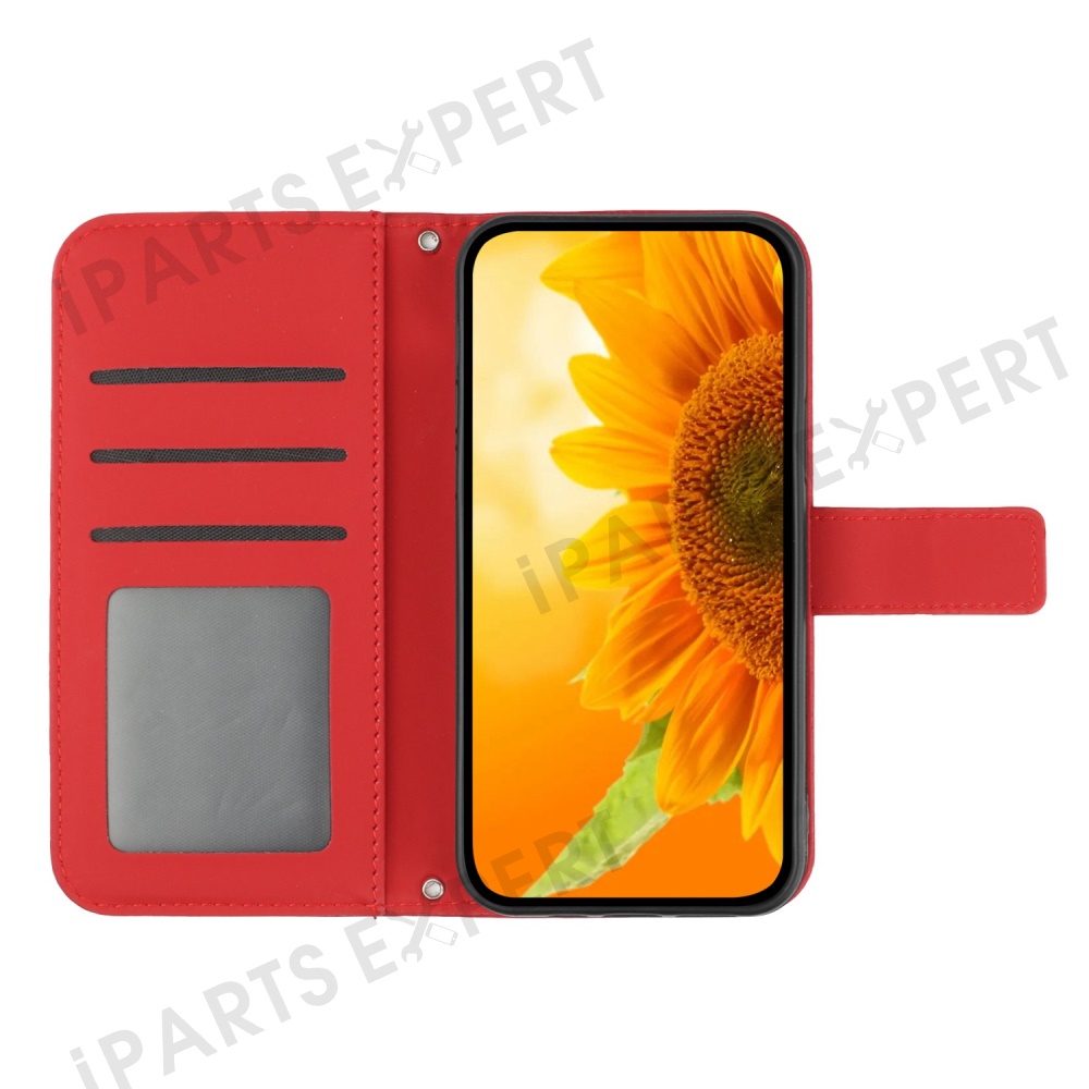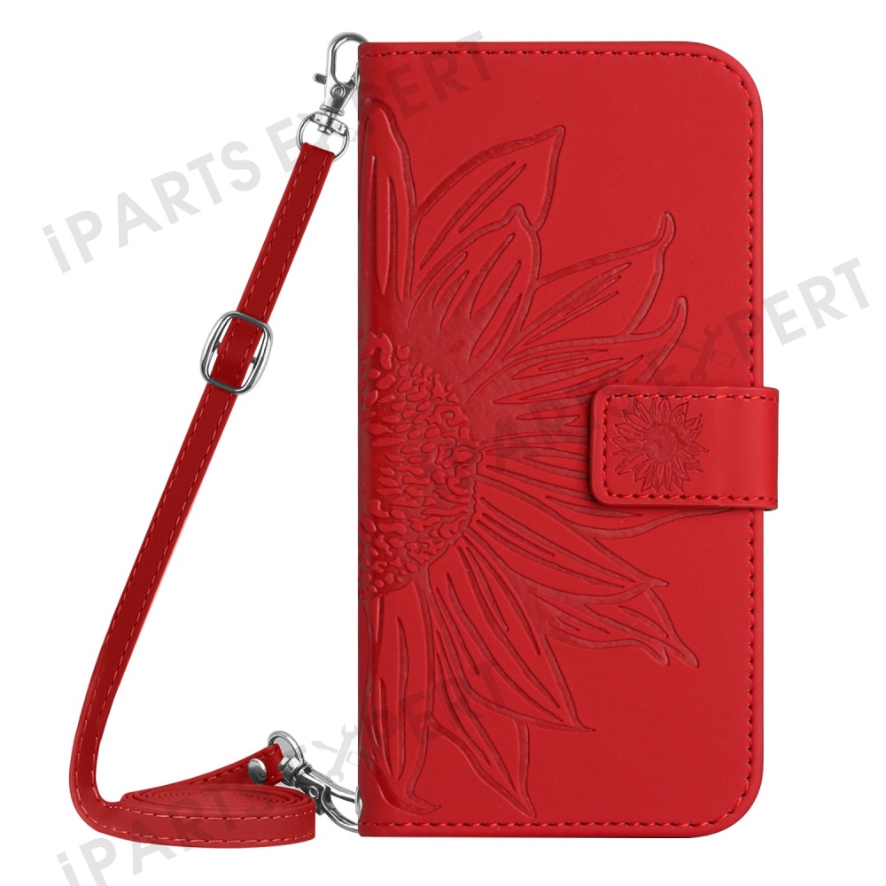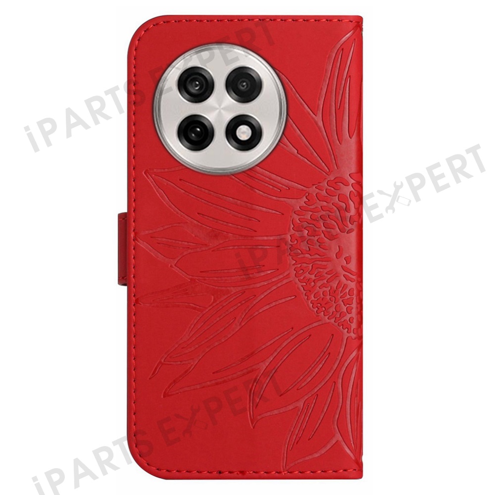 For OnePlus 13 Case Sunflower Imprint PU Leather Phone Cover with Long Strap - Red