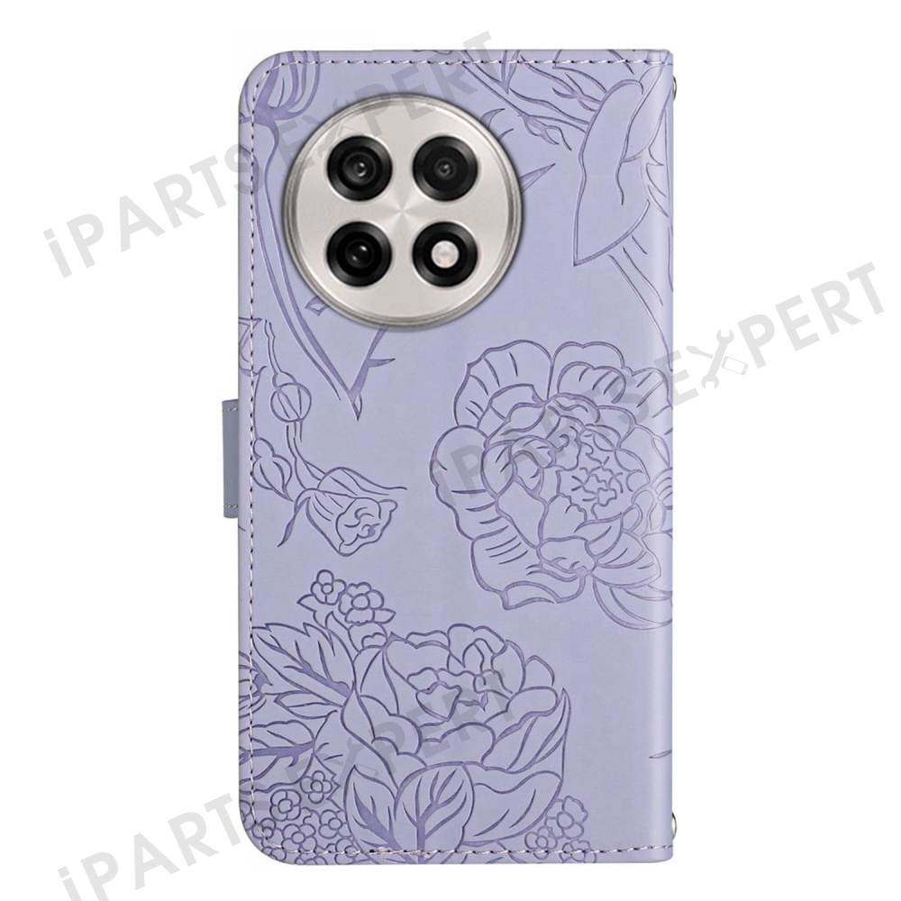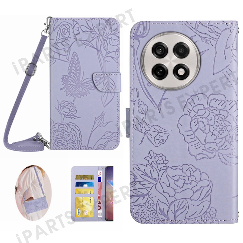 For OnePlus 13R 5G Case Butterfly Flower Imprint Leather Phone Cover with Shoulder Strap - Purple