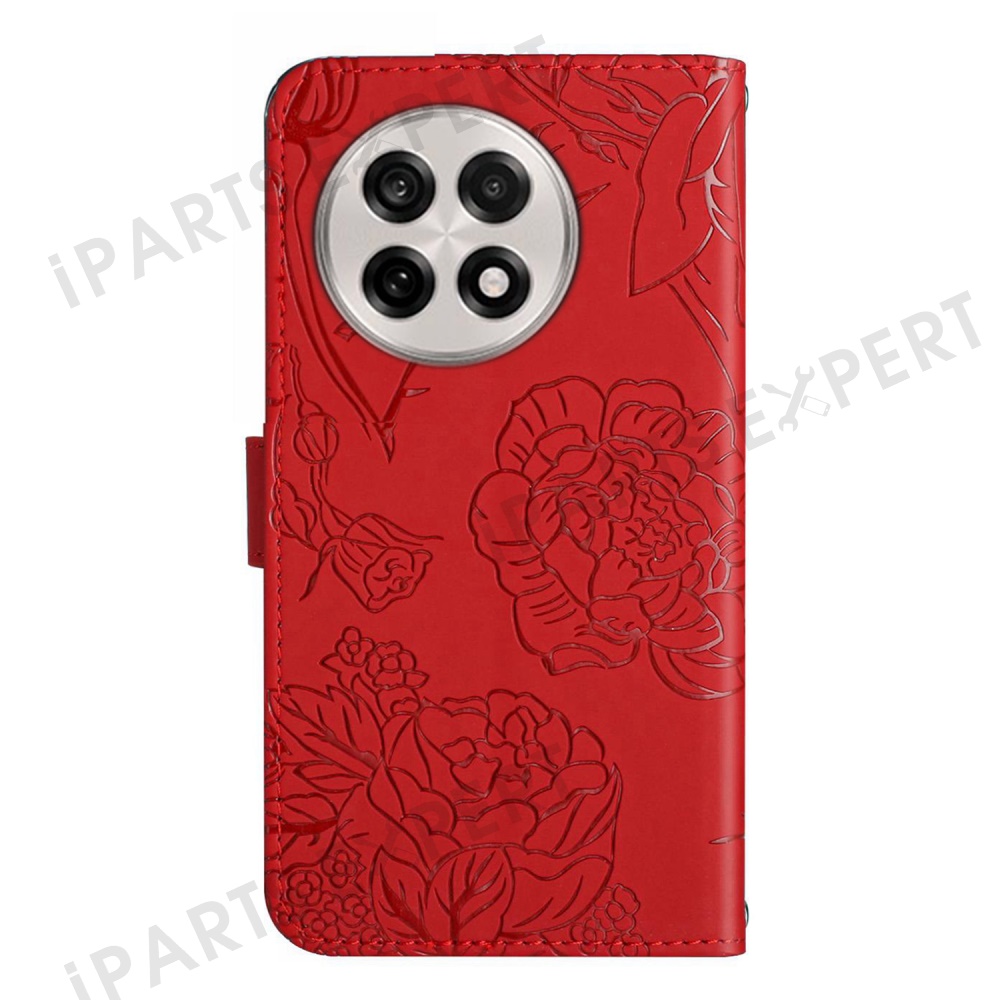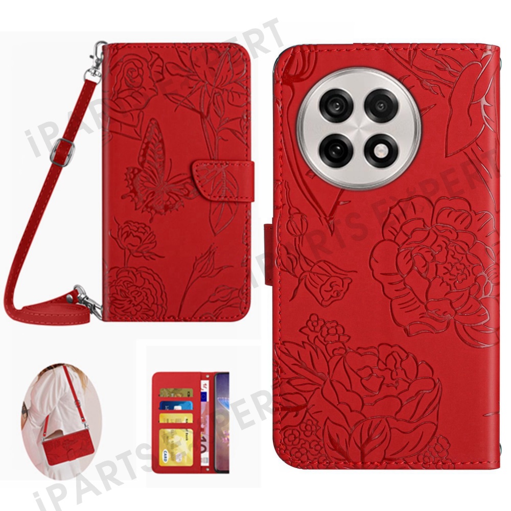 For OnePlus 13R 5G Case Butterfly Flower Imprint Leather Phone Cover with Shoulder Strap - Red